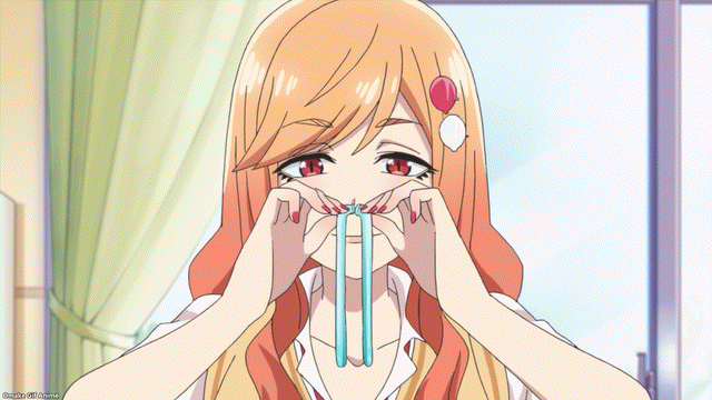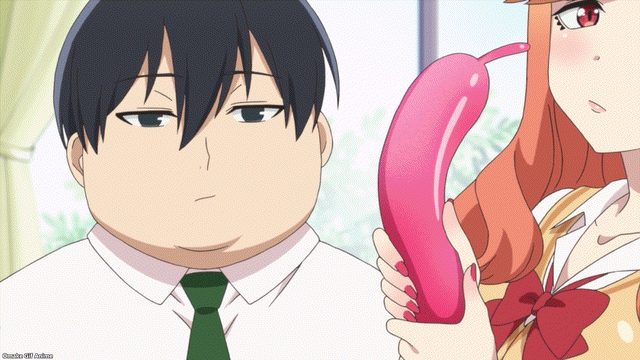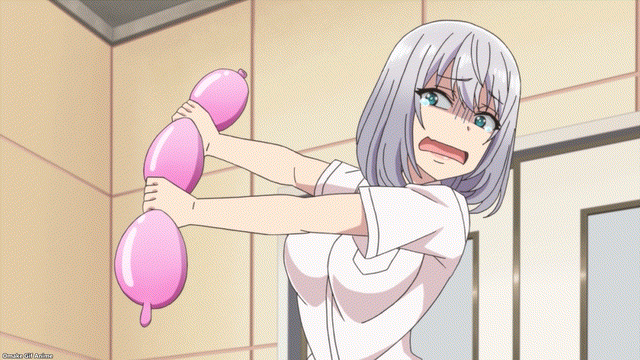 Balloon blowing tutorial. Stretching is key! Big first puff is key! Saki-chan has blowing skills but loses girly points for the nostril puffing. Tejina-senpai holding that green balloon reminds me of the bitter melon from the last episode. Lots of rubbing and squeezing going to happen here!