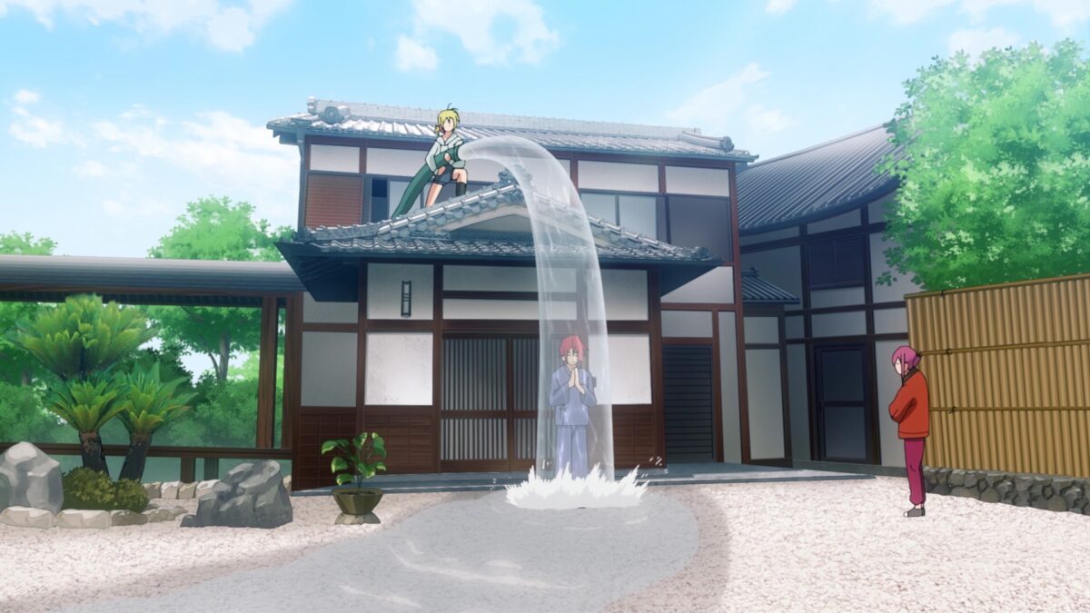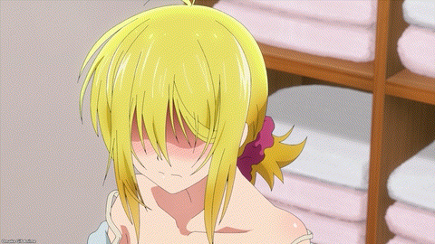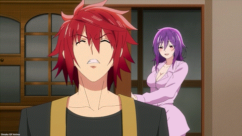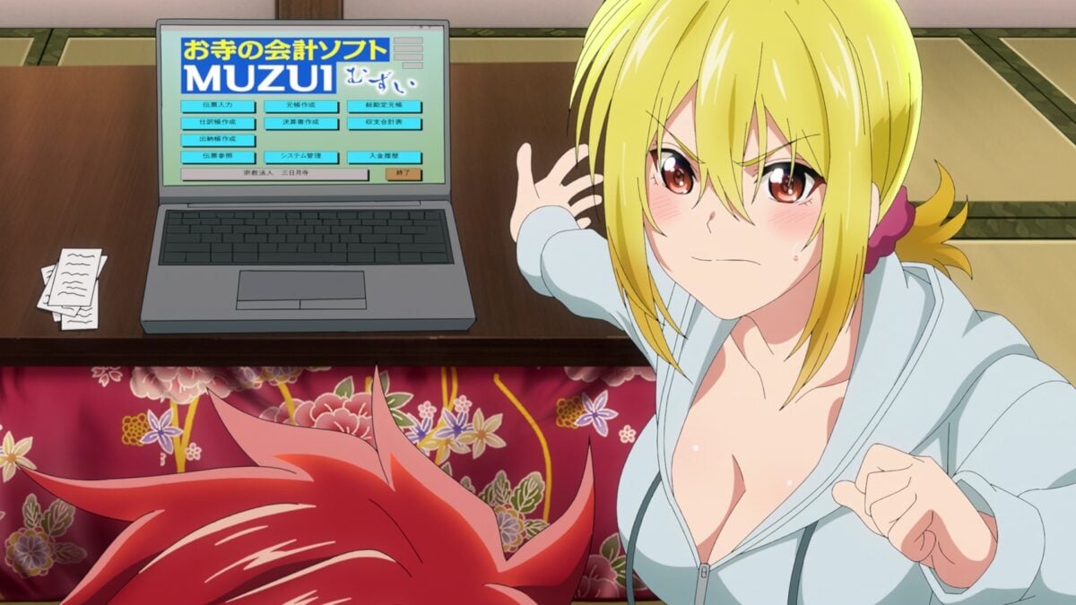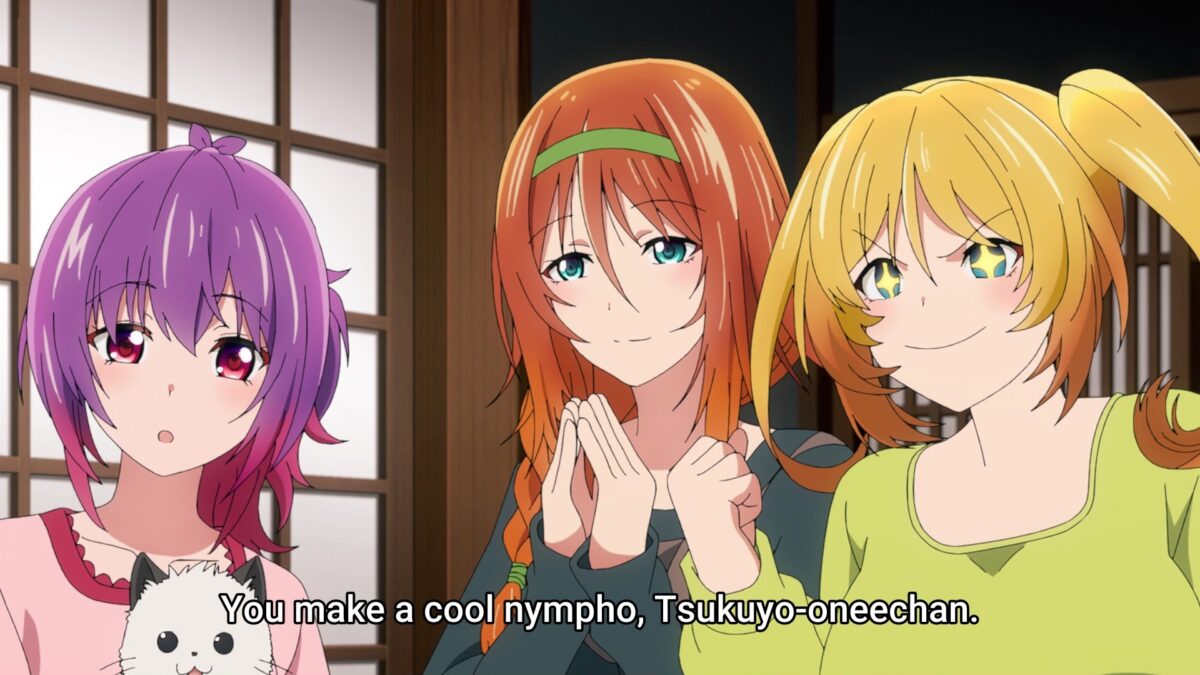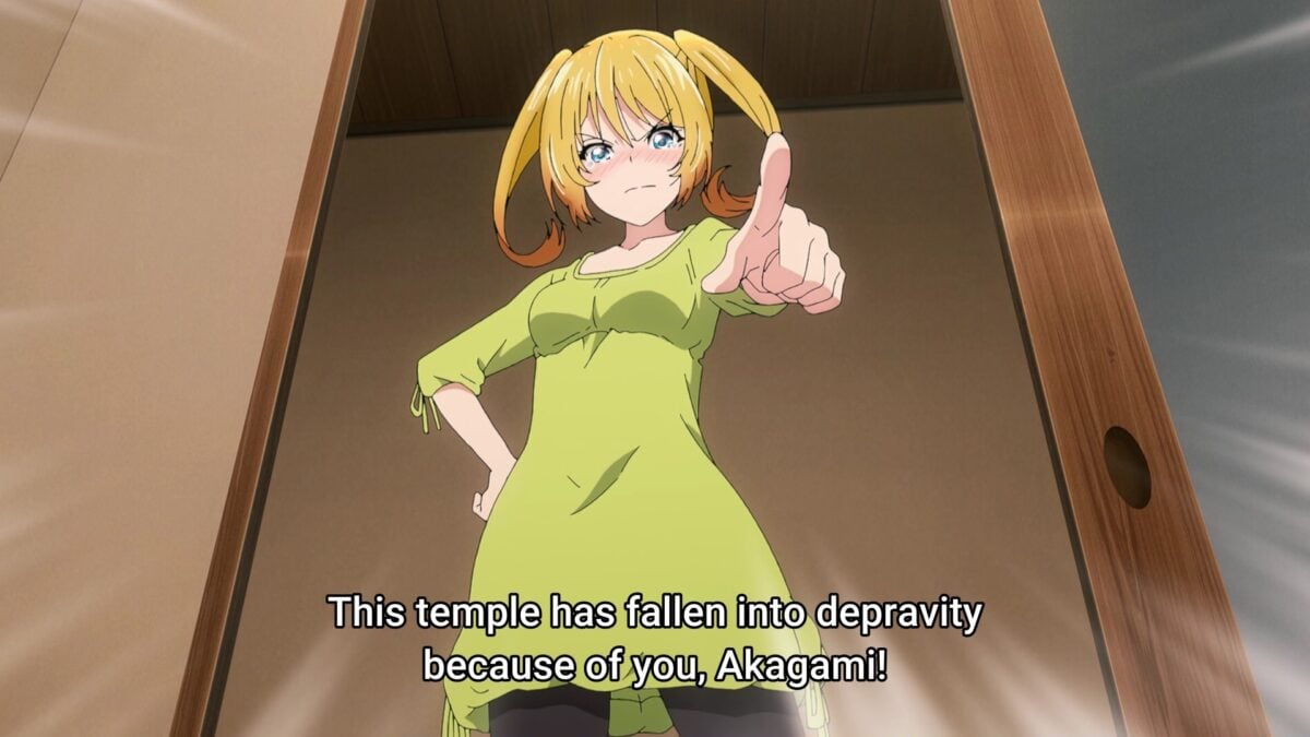 Five o’clock and Akemitsu starts temple chores. And he’s done! Uh oh. The girls at the Crescent Moon Temple are too used to living without the male gaze. Slovenly sexy pajamas on Yuzuki there. Uh oh. Tsukuyo can’t complain about Akemitsu’s cooking because it’s better than everyone else’s. She’ll have to follow Kiki’s seduction plan. Boobs in the face! But before that, can she take down his other skills? Nope. Even accounting software! Waterfall training with a fire hose? Okay. Kiki can barely hold in her laughter. Satori (悟り, さとり — enlightenment) reached from a high school girl’s uniform. Akemitsu is one of us in TenPuru! Tsukuyo fell into Kiki’s trap.
