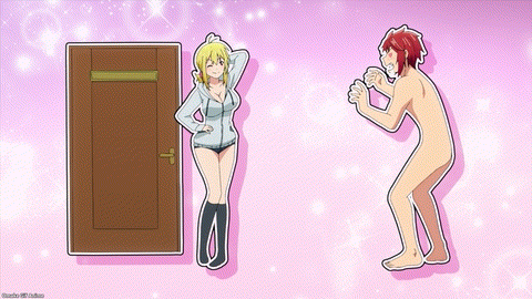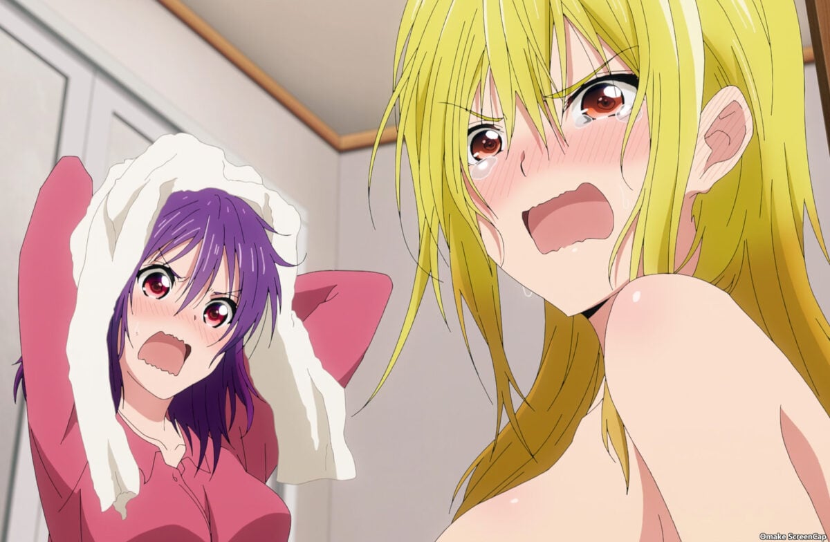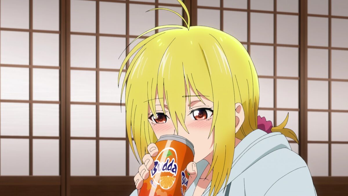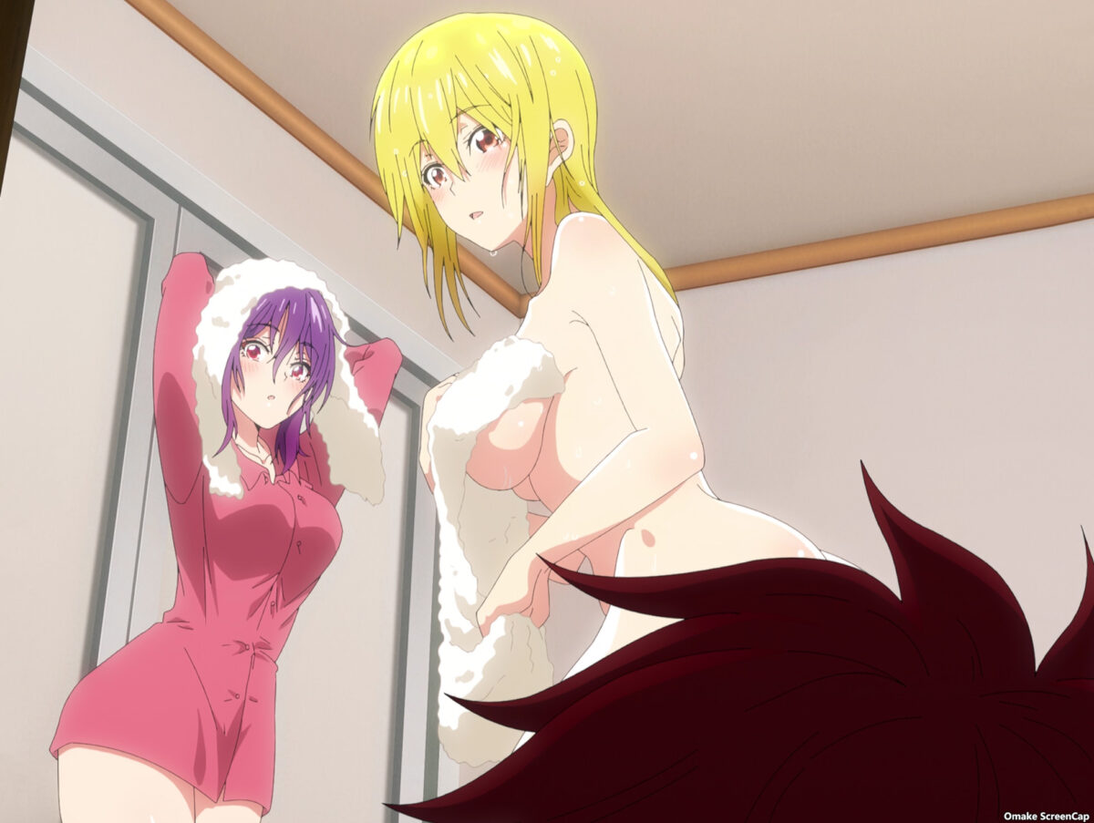 Bathroom lucky lecher hijinks! Let’s go! Uh. That’s no longer an accident, Tsukuyo! “Only nymphos suddenly strip off their clothes!” she thinks. Not true! Unfortunately. Tsukuyo meant to put on a show for Yuzuki, but I’m sure an accident will still occur. There it is. Naked falling box protection. Now it’s a lucky lecher scene! Sealed with a kiss! Tsukuyo’s pervy plot worked, but now she regrets it. She makes a cool nympho, though. Even her Fanta, er, Budda orange soda can’t make her feel better. Worse, Yuzuki is avoiding Tsukuyo now. Does Yuzu think Tsukuyo is a hussy? Oh. The innocent Yuzuki saw man parts and recalled those bits when she saw Tsukuyo’s face. All the secrets came out, including the “seduction strategy.” Akemitsu will be staying, except he already left!