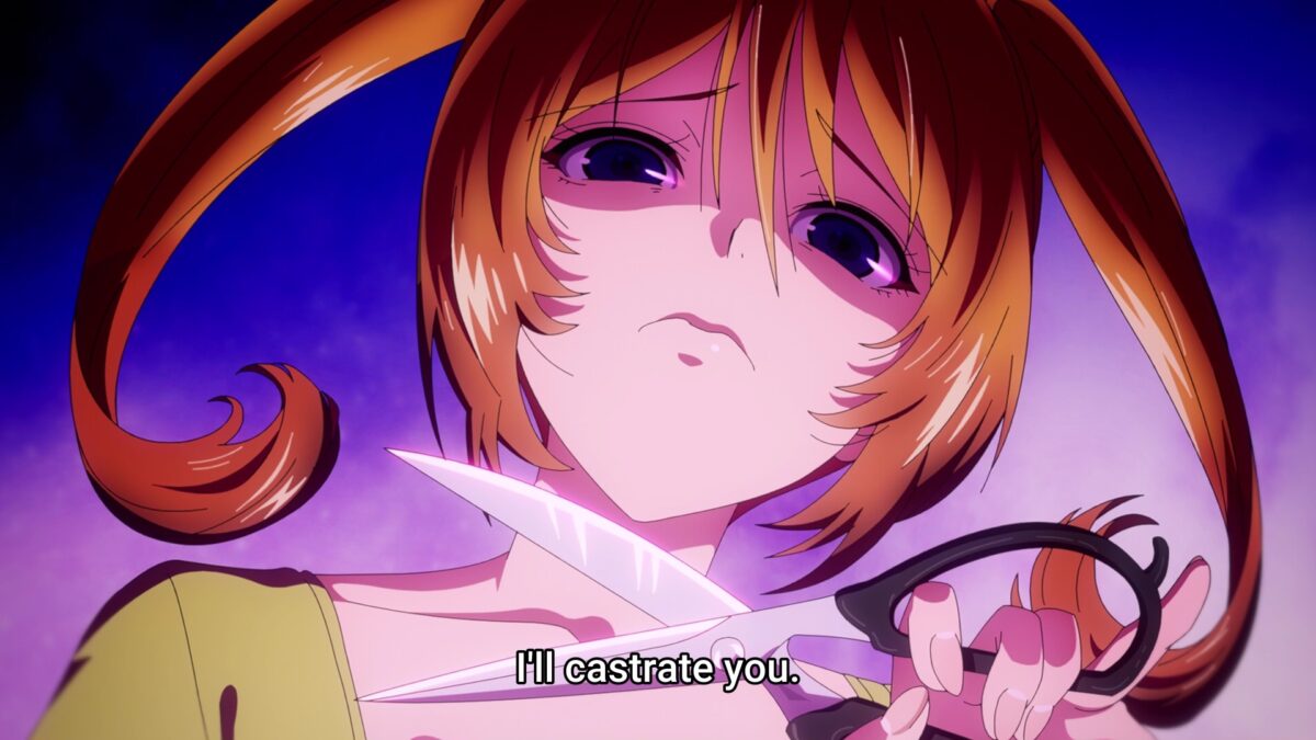 What is this odd interpretation? Mia thinks Akemitsu already “beat” Yuzuki and Tsukuyo. At what? Instead of making Akemitsu move out of the temple, Mia wants to castrate him! Was that an option? Akemitsu is surprisingly amenable. The other girls, not so much. Where are the Aoba sisters going? They’ll be suspiciously absent when Mia and Akemitsu hash things out “with their fists.” Oh, finally. Kagura introduced herself to Akemitsu. Are we only on the second day of TenPuru since he arrived at the temple? Mia’s version of Japanese folklore is quite a mishmash. 百人一首 (ひゃくにんいっしゅ, hyakunin isshu) is a pack of 100 poems by 100 poets. It is not a story about a samurai killing one person to save 100 people. The most dangerous thing about hyakunin isshu is a paper cut.