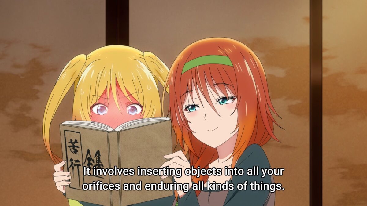 The sex-possessed bosom buddies can support each other’s therapy. I guess. Akemitsu has an ally of justice at the temple! Mia favors “plot” more than “justice,” but at least she can make her first male friend. Kagura approves! Now they can play “penance” games all night long! Like Twisted Twister! Unfortunately, Yuzuki did not accept these “grappling” games.