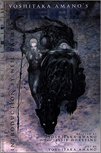After fifteen years with the company, he became a freelancer to flourish as an artist. Amano gained notoriety by having illustrations published in the Twilight World feature of Hayakawa’s SF (Science Fiction) Magazine, a Japanese publication. This would lead to Amano working with various writers. His first novel cover and illustrations were for the Chimera (Kimaira) series by Baku Yumemakura. Yumemakura and Amano would collaborate on several more projects over the years. The 1996 Legend of the Hungry Wolf (Garōden) novel series has Amano’s work in the early volumes. The Amon Saga OVA (1986), written by Yumemakura, used Amano’s character designs and conceptual art.