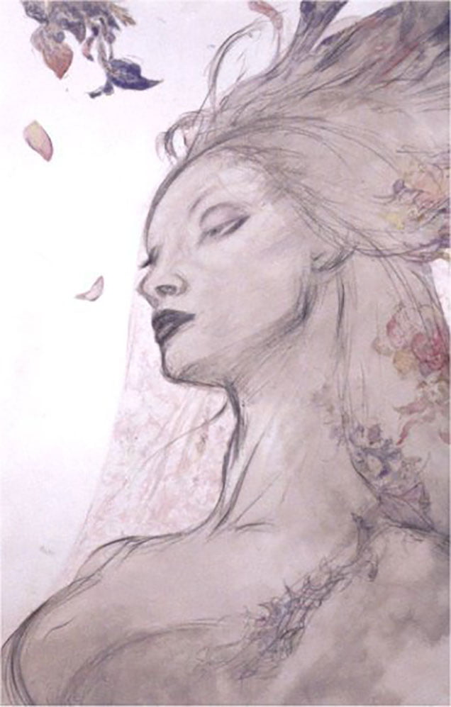 Not content to stick with animation and printed media, Yoshitaka Amano used his talents in live-action movies. He was art director for the movie In the Aftermath (1988) which was co-written by Mamoru Oshii and has ties to their film Angel’s Egg. Amano starred in the 1998 movie New Rose Hotel with Christopher Walken and Willem Dafoe. The movie is based on the William Gibson (Johnny Mnemonic) short story. The live-action, Onmyoji (2001) and Onmyoji 2 (2003) films featured designs by Amano. I own both movies and have always found them subtly beautiful. In 2007, Amano and several others directed the anthology film Ten Nights of Dreams. He directed the seventh dream.