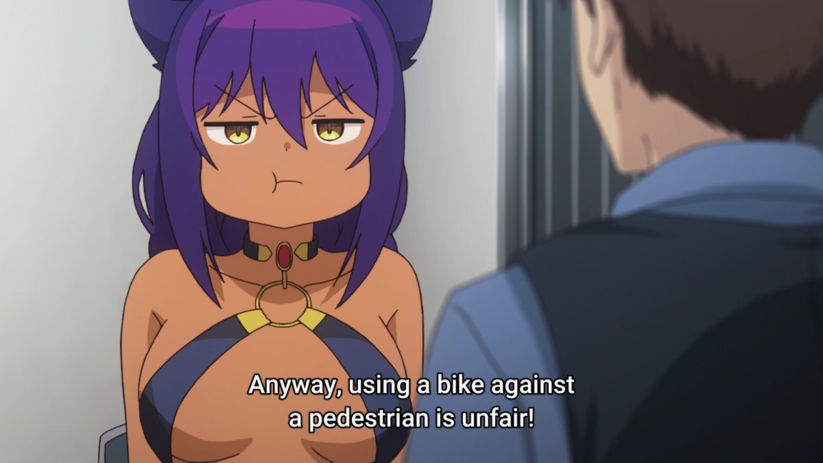 Jahy is in the beer-serving groove. Store Manager proposes making her the shift leader, putting her in charge of the other employees. But there are no other employees… Hey, authority is authority, right? Does Jahy walk home dressed like that every night? Uh, no wonder a bike cop stopped her. Jahy, run away! Terrible. The Great Jahy remembers this cop being helpful, er, condescending to her when she was in her chibi form. Store Manager and Landlady needed to pick her up from the police box! Great Jahy pouts.