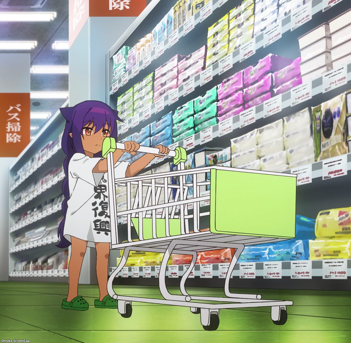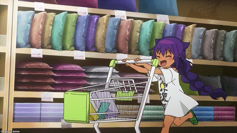 The Great Jahy’s good mood wasn’t only about the rich scent from Saurva’s shampoo. It was also payday! Time to buy weapons to defeat the Magical Girl. Where? At the home goods department store! I would love to have seen Jahy’s shopping cart next to an adult-sized one because that little thing must be the kiddie version some shops have. Oh, dear. Jahy should have gone shopping with the Store Manager or the Landlady. She has no experience or defenses against useless gadgets and manipulative upselling.