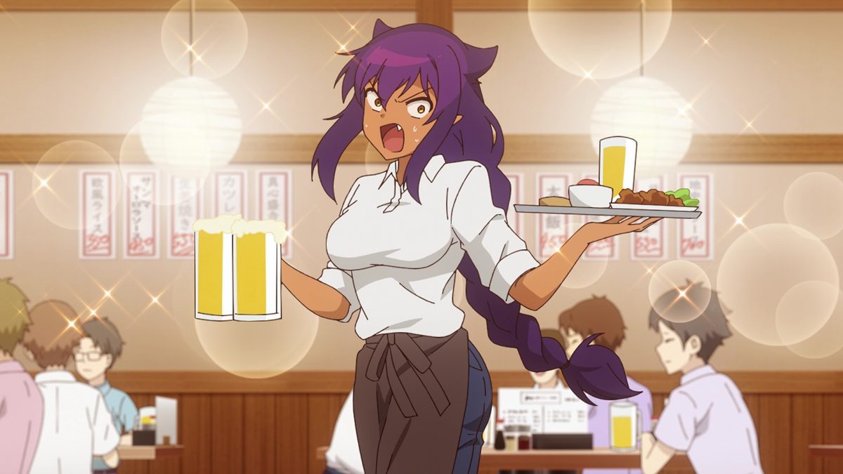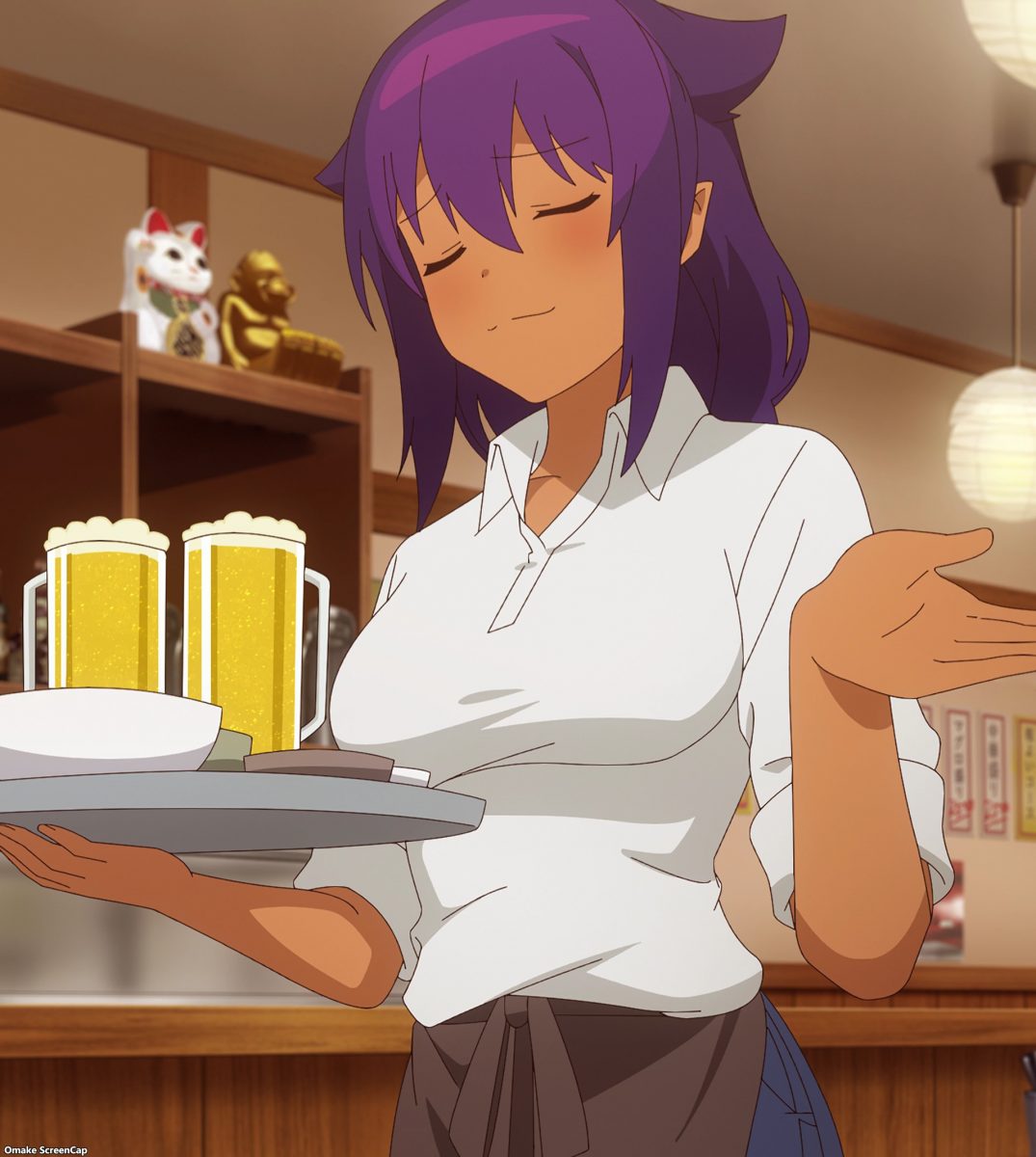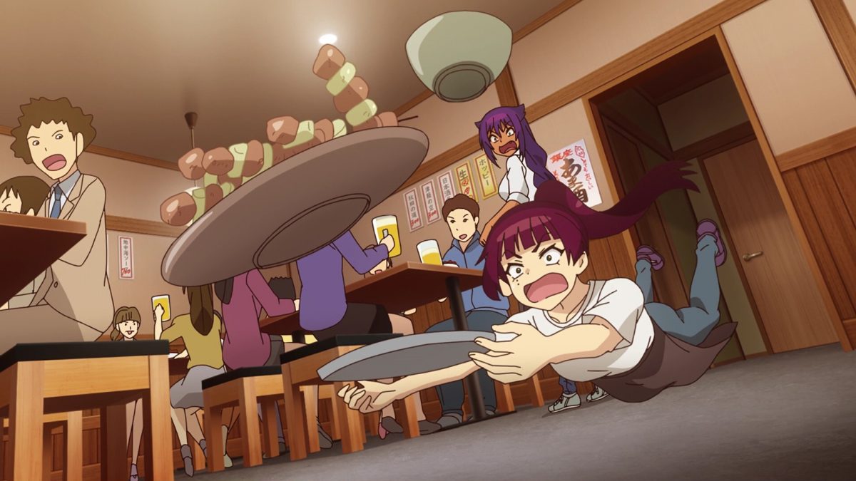 Now Kyouko needs on-the-job training. Jahy will be her mentor! It’s time for The Great Jahy to joke about how clumsy an all-powerful Magical Girl can be. How many plates and glasses will Kyouko break on her first night? Hoo boy! Look at Jahy contort to save beer mugs and plates. I’m still sad about that spilled beer. Extra help should have made Jahy’s job easier!