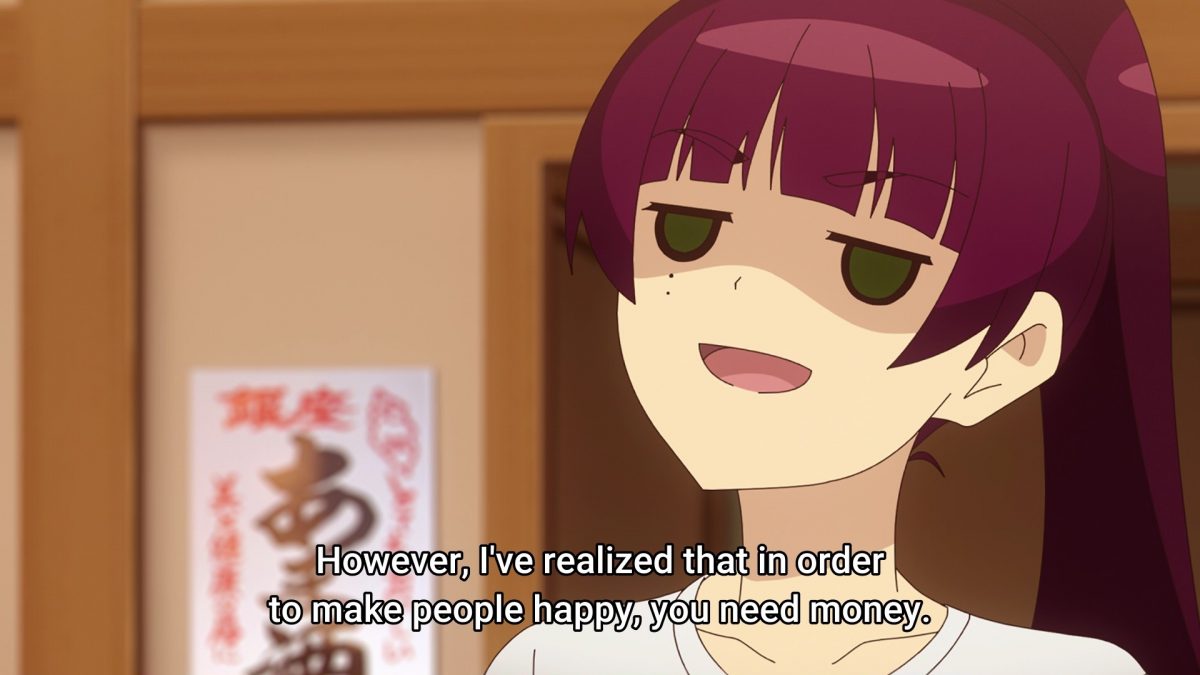 I wonder if Maou will keep visiting the Craft Pub Maou because the Store Manager is generous enough to fix her delicious food. Jahy might not like that either because it will be another display of Maou preferring someone else’s company to hers. The dark truth of the human world, according to The Great Jahy, is what Kyouko discovered: “To make people happy, you need money.” Jahy knows that all too well.
