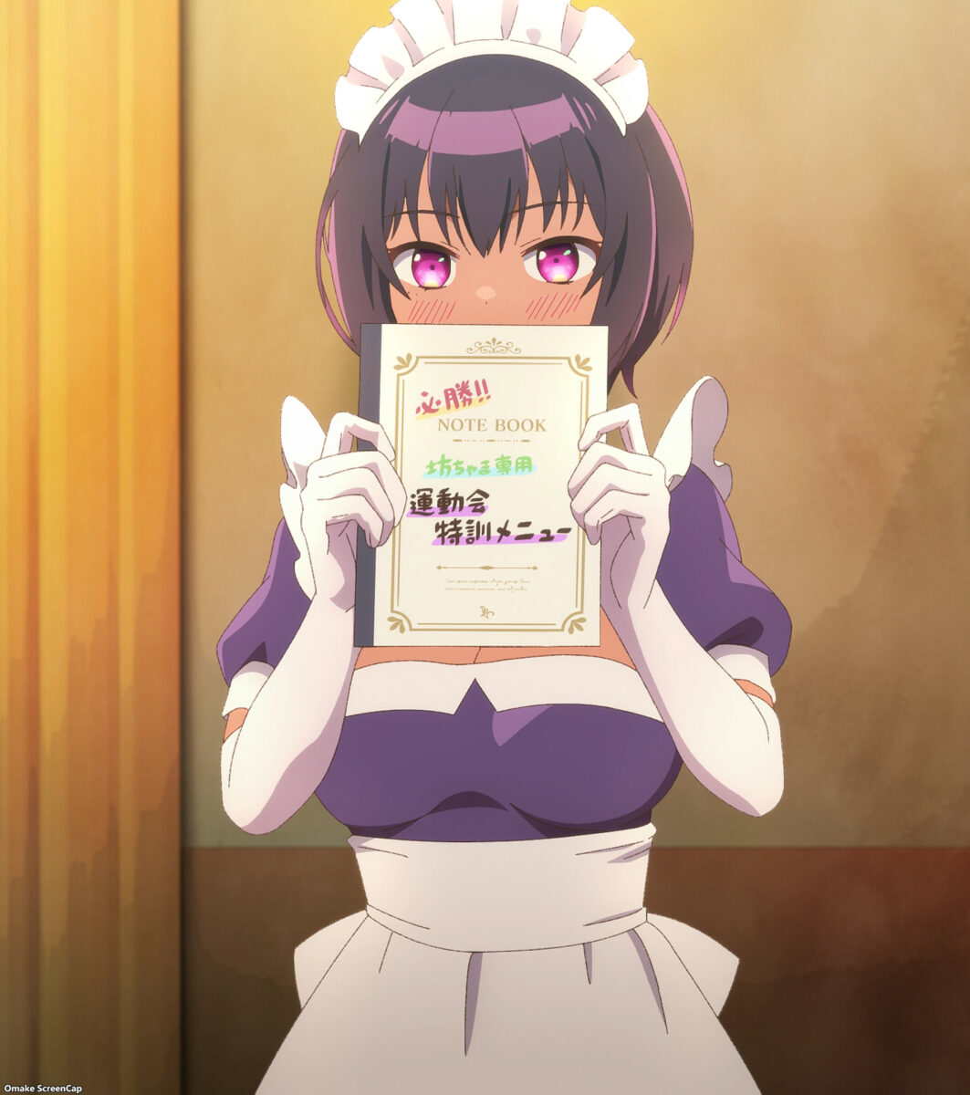 Yuuri runs up and down his halls. Why? Ah. It’s a sports day episode for The Maid I Hired Recently is Mysterious. Haha! Lilith called Yuuri “suspicious.” Take that, bocchama! Cute. Lilith thinks she’s helping Yuuri train by cheerleading. Where is her maid cheerleading outfit? Lilith’s self-consciousness makes her blushing cuter. Yuuri agrees! Bocchama has no filter. This miniature Chad. He wants to keep Lilith’s cute cheering to himself. Ah. Lilith can come to sports day but tamp down the cuteness. That’s only for the privacy of their home! Now I’m curious about Lilith’s strategy for diminishing her attractiveness. I’m sure the maid will still look suspicious.