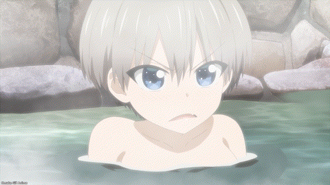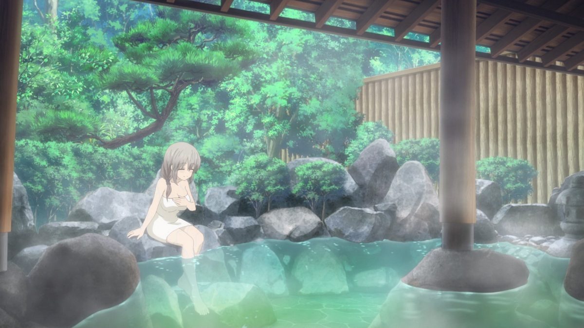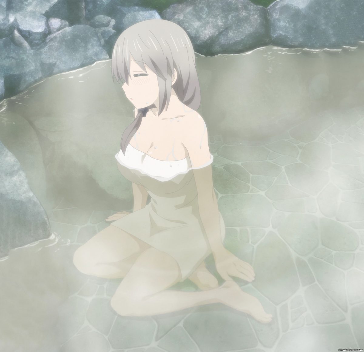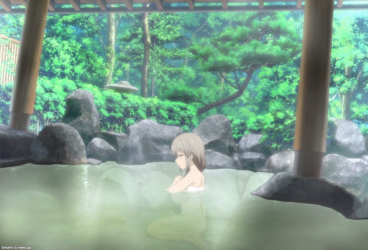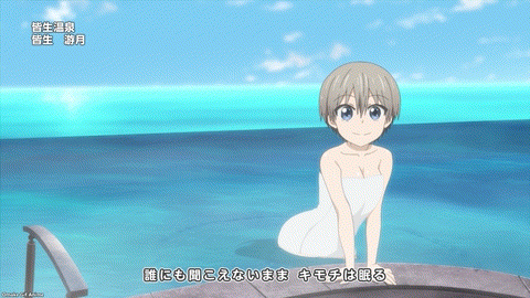 Oh nice. Tsuki Uzaki will demonstrate the healing waters of the hot springs in Tottori. Now, what would Uzaki-chan and Sakurai have done if Ami and Sakaki didn’t show up to help split the rooms into boys and girls only? Ha! The boys only room turns into boys’ love wall slamming! Nice. Uzaki walked in on Sakaki and Sakurai’s intimate conversation. Karma repays Uzaki by making her give Sakurai accidental paizuri. The oppai-megane tour guide doesn’t like the sound of whatever they’re doing in that mist room.