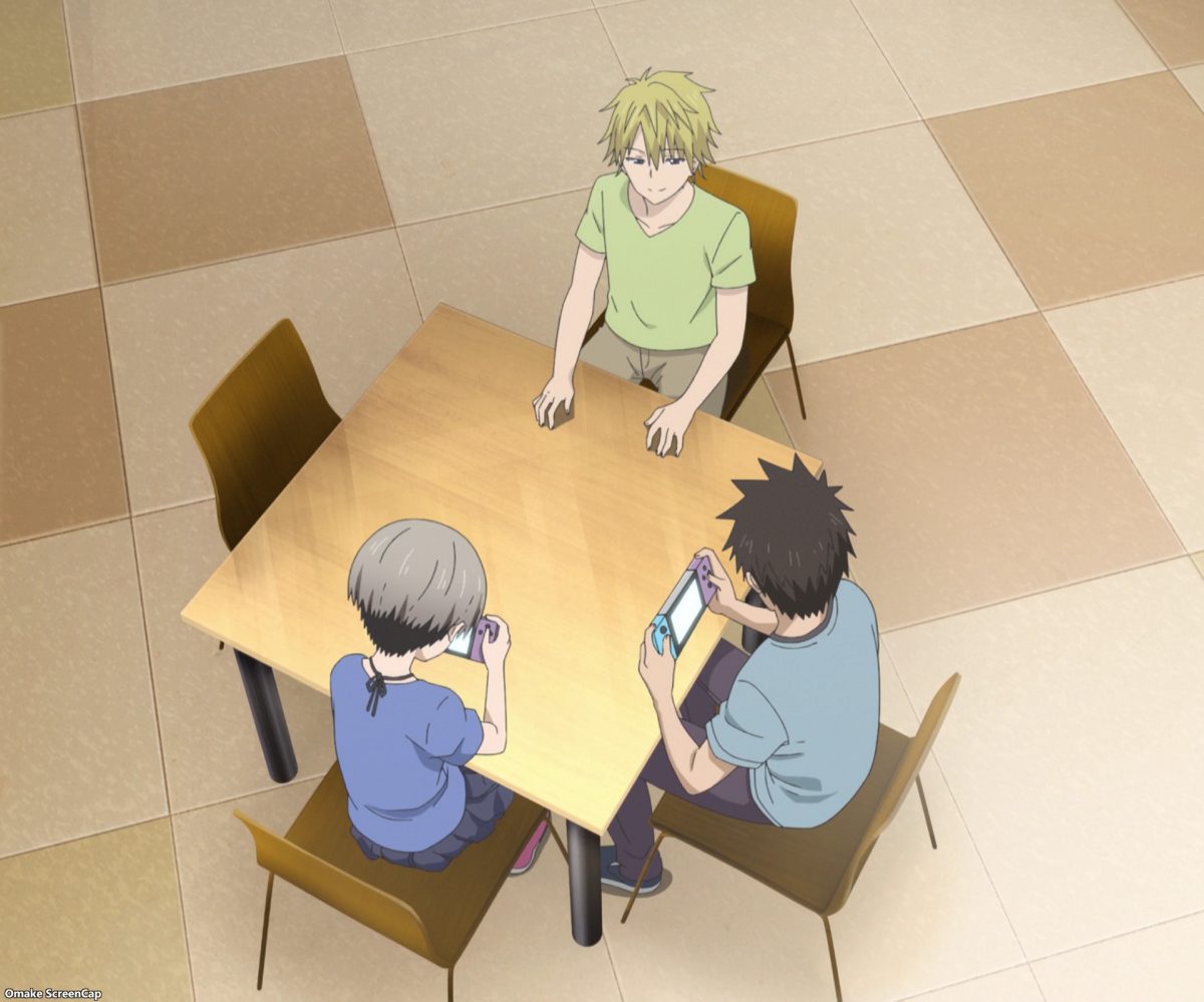 Dueling Nintendo Switches. So, it starts. Itsuhito begins his lovey-dovey summer romance mission to get Sakurai and Uzaki together. Ah. And uh oh! Sakurai claims he hasn’t done anything sexual with Uzaki, but she thinks otherwise. Eeeeehhhhh? I think she’s referring to his accidental groping during his VR scuba diving, but there was also the butt-slapping when she got stuck in the bushes chasing a cat, and the boob pressing in the crowded train. Ouch. That’s not a compliment for a dude, calling him “safe.” Uzaki-chan has no illusions about her senpai, describing Sakurai as a “gloomy klutz of a sleepyhead villain loner.” So many adjectives.