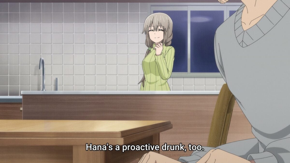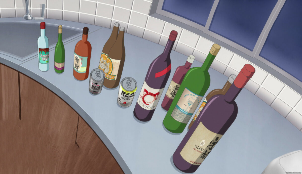 New plan for Uzaki-chan Wants to Hang Out!: get Sakurai drunk. But no flirting! The drinking is to make Sakurai have specific amnesia. That won’t work out right! Look at all the brands! Uzaki whisky, Kuso Cat wine, Uza strong cider, Kuso Cat Beer, and Uzai Beer. Ha! Chocolate Mint Schnapps! And Sakurai is plastered. In vino veritas, here we go! Fujio hates this because Sakurai was supposed to keep his gym chat a secret. Tsuki loves it because drunk cute compliments are the best! Drunk Hana smugly agrees!