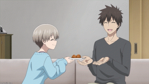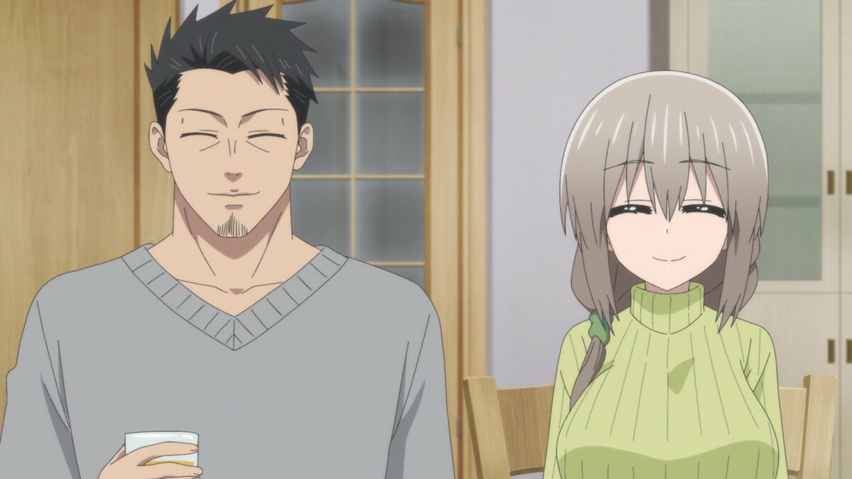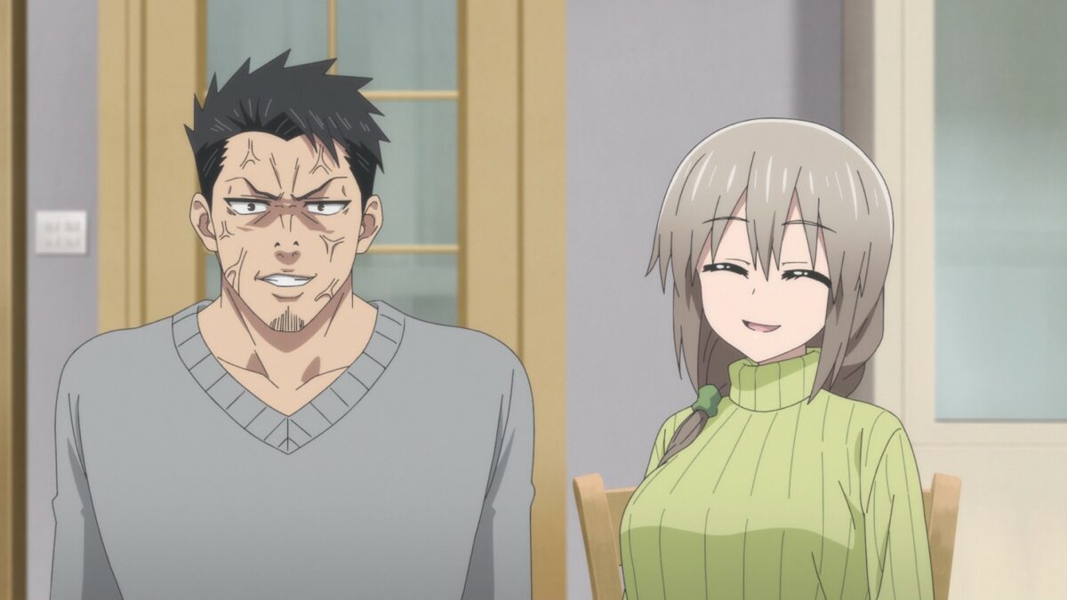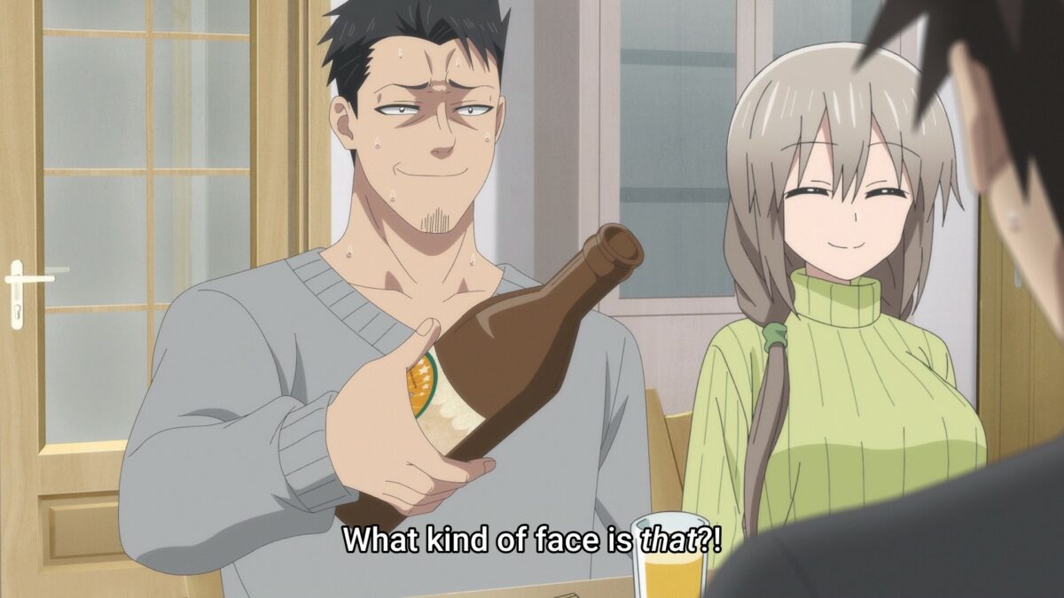 This will be delicious! Uzaki-chan thinks there’s a slight chance Daddy Uzaki will like Sakurai. The audience knows the odds are in the 50-50 range. We only have to see how much he’ll weigh the future boyfriend he imagines, against the Sakurai, whom he knows, as his gym bro. Uzaki-chan hopes for the best. Here we go, here we go! Aaaahhh! Papa Uzaki Bear won out!
