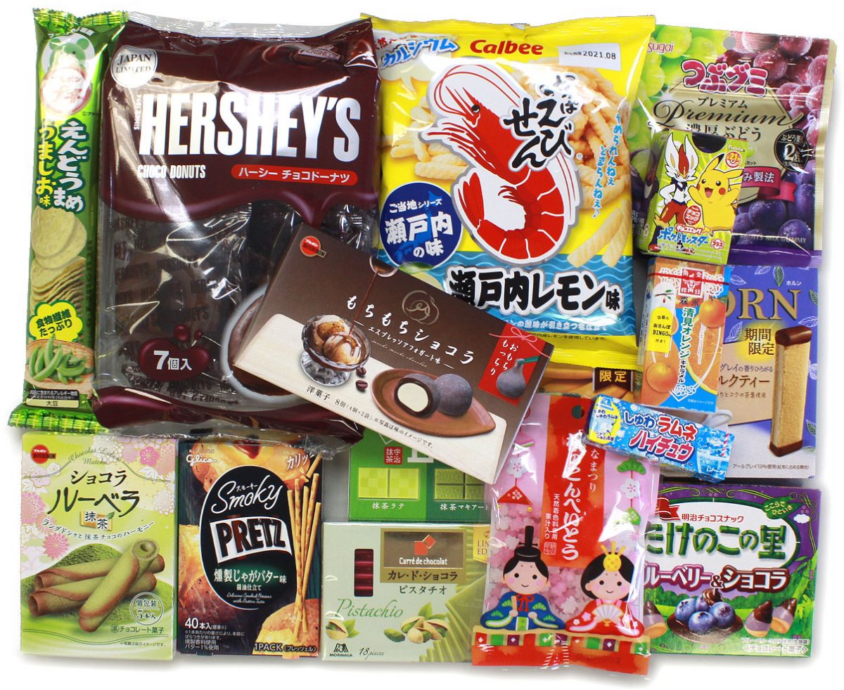 The Japanese are a very seasonal people, and love to enjoy different foods in each season. Naturally we’ve got lots of Spring-themed items in this month’s Japan snack box. We’ve got the Pokemon Choco Egg representing Easter, wonderful Premium “Kiyomi” Orange Caramels, a limited flavor of Village of Bamboo, Blueberry and Chocolate, Peach Kompeito candies, pistachio flavored chocolates that are very elegant, Horn Milk Tea flavored cookies, Fujiya LOOK Matcha, plus a rare item, Hershey’s Choco Doughnuts. The full list is at the bottom of this post.