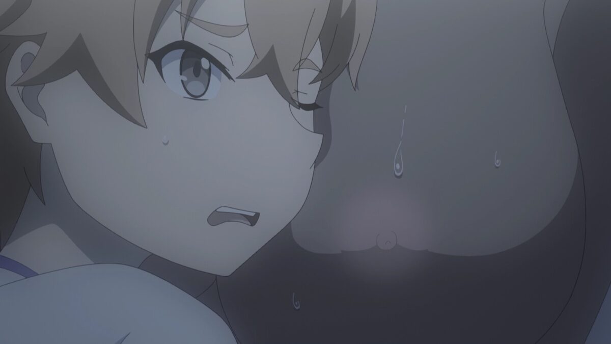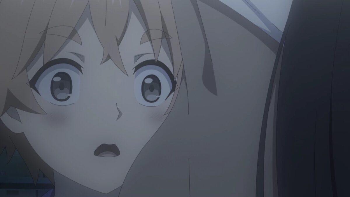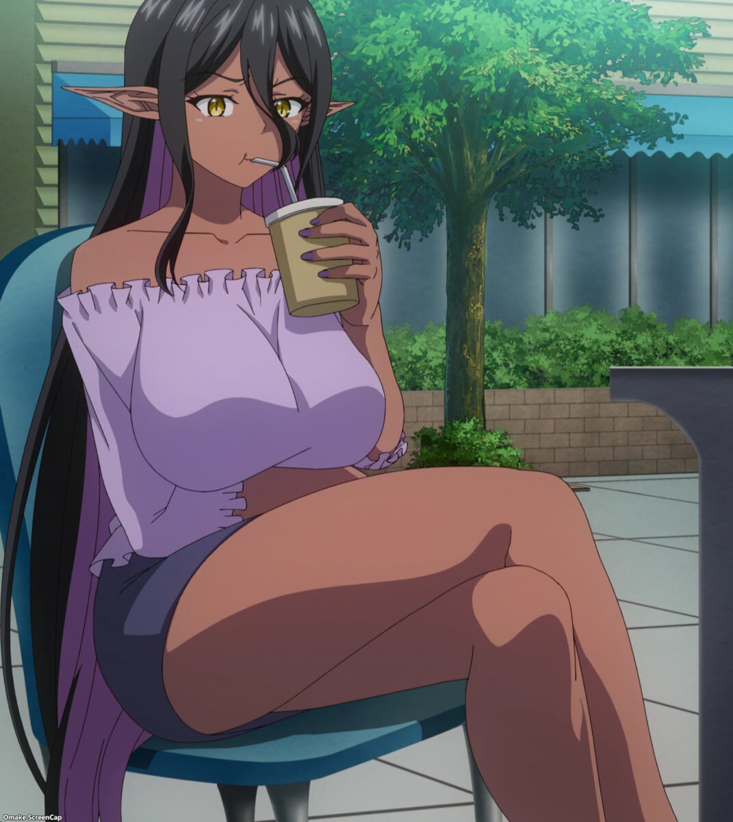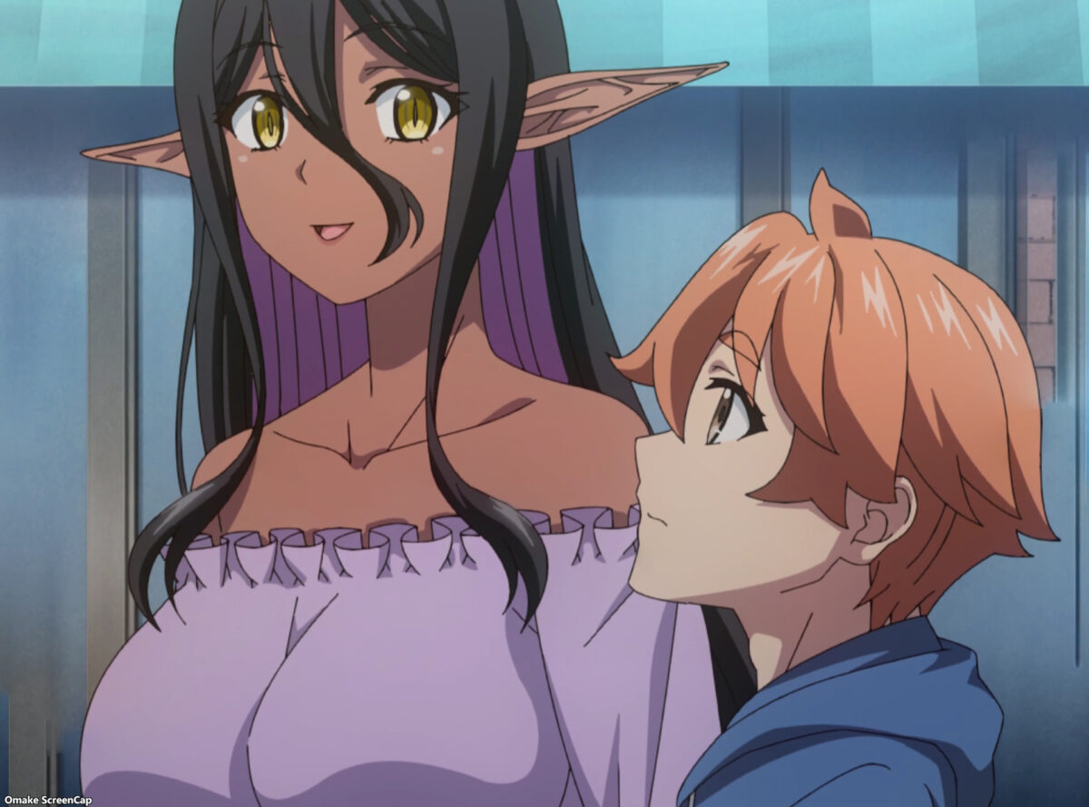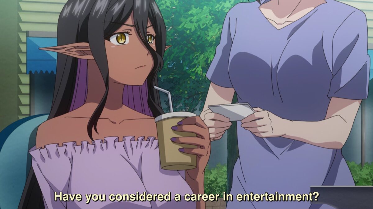 Mariabelle sits outside waiting for Hinata, but she has a scowl on her face. Does this scene allude to her empathic abilities that we learned about in the first Yandere Dark Elf episode? Did she hear a modeling agency recruiter’s thoughts before she approached? Mariabelle has dealt with those offers after she adapted to feeling the emotions of human crowds.