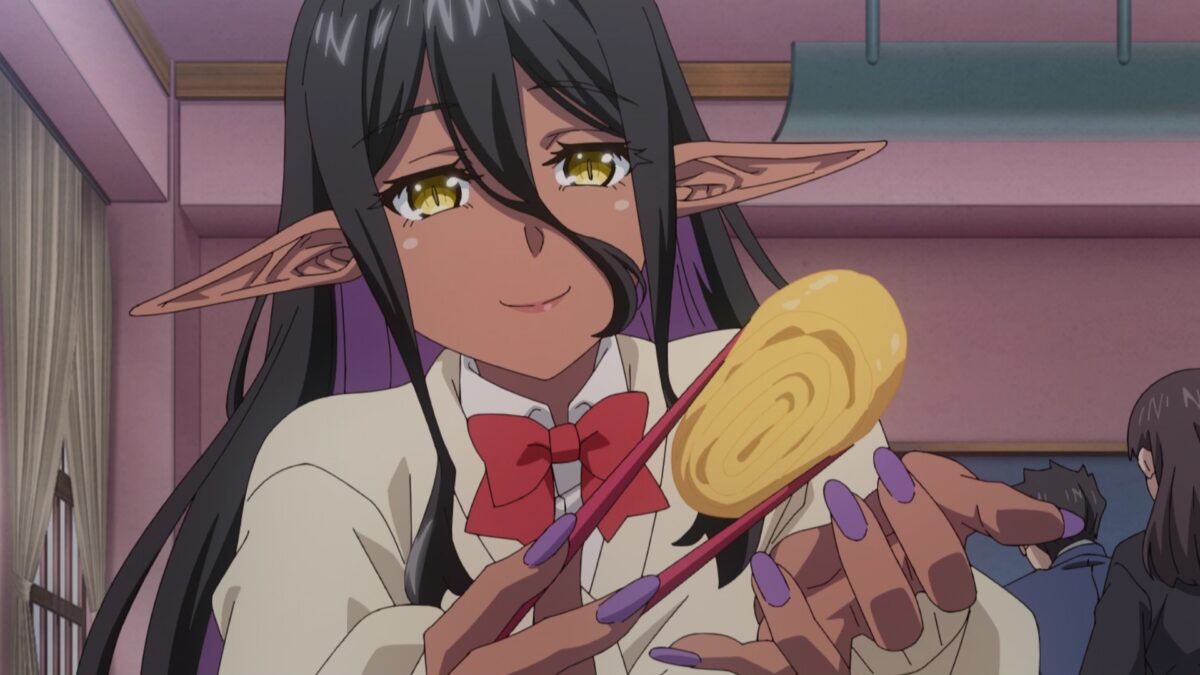 Mariabelle apologizes to Sakura by feeding her some of Hinata’s scrambled eggs. Hinata, it’s your turn to fill a girl’s mouth. With food! With food! Oh? Sakura noticed his reluctance to show attention to Mariabelle. Ah. Some of Hinata’s emotional preoccupation comes from how well his yandere dark elf girlfriend has adapted to Japan. She treats other girls well enough.