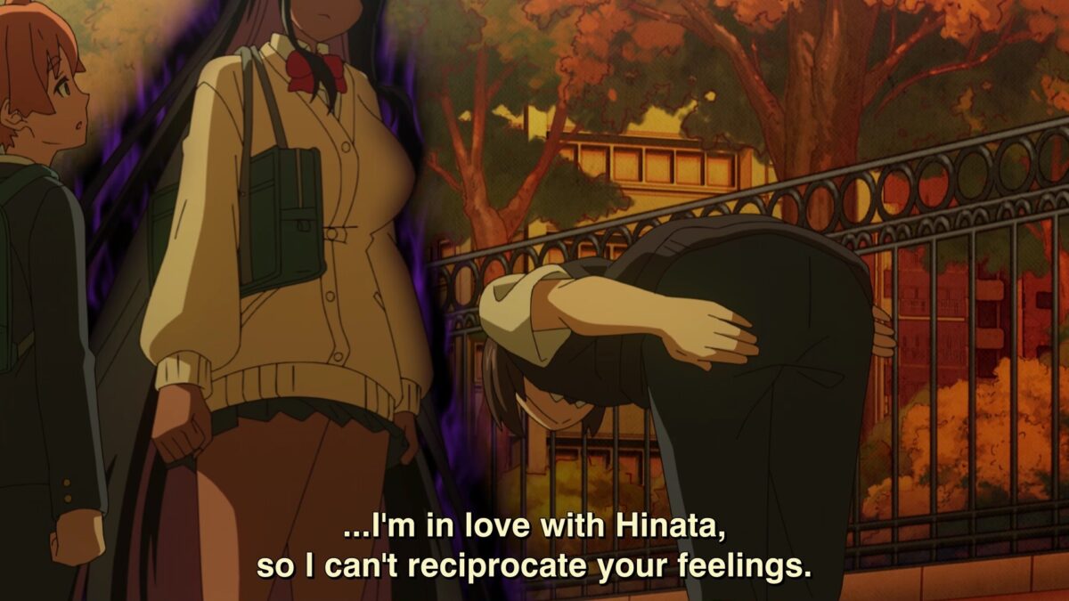 The whole genre of hypnosis in hentai (e.g., Saimin Seishidou) is the wish fulfillment insert side of the coin for ugly otakus who would never have a chance to have sex with the best-looking girls in school or the office. It joins the blackmail NTR genre for losers taking advantage of women. Some hentai fans enjoy the bitter with vanilla. I get that. Just look at Yandere Dark Elf! This show’s source is a hentai doujin that stars a dark elf who pushes her clingy love onto a wholesome Japanese teenager. How will Hinata react to someone else openly expressing interest in Mariabelle when he’s still been wishy-washy over his own feelings? Here comes the drama as we approach the season finale.
