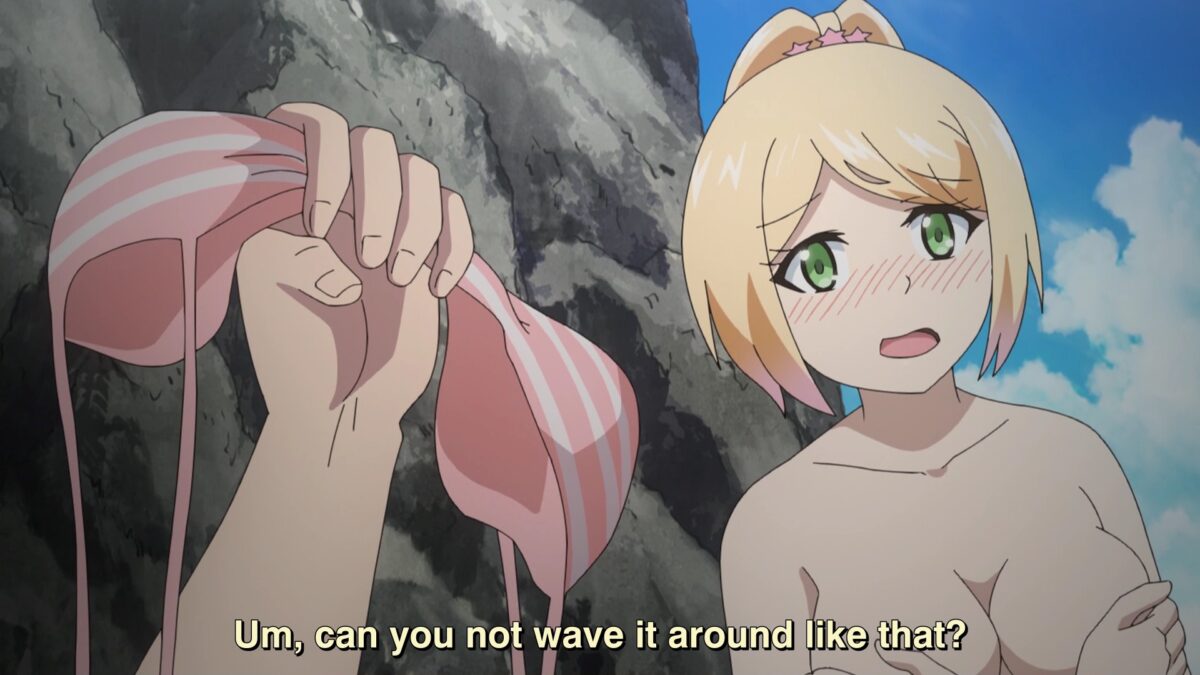 No more games with the sunscreen lotion, but a yandere dark elf suggestively licking a popsicle is an acceptable replacement. Mei suggests the group try another swimming race. How quickly does she think Mariabelle learned how to swim? Oh. Hinata competes against Cecil while the others watch. Uh oh. We have a naughty dolphin! It cheated and helped Mariabelle win the swimming race! It likes Sakura the best, though. Or the breast! It stole Sakura’s bikini top! New quest for the Hero’s Party: rescue Sakura’s modesty! Quick work. But stop waving the flimsy fabric around like a flag!