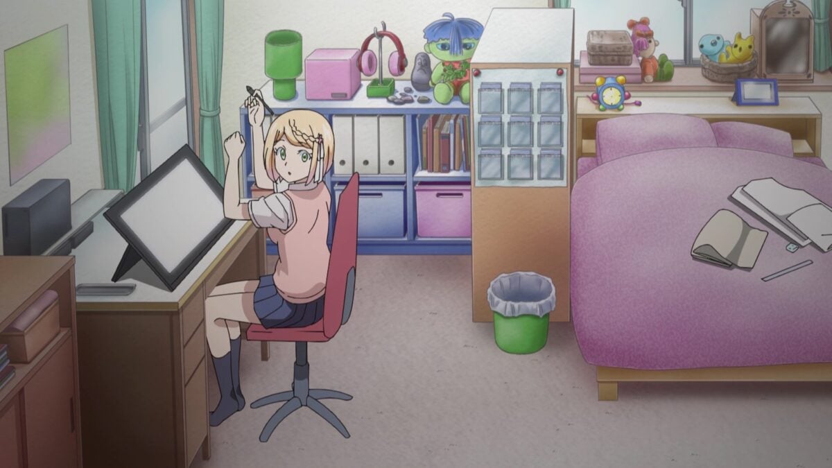 We knew Sakura was an otaku who loves fantasy adventures, but she also draws manga. How should she draw her new female character, though? Eureka! She’ll make her resemble Mariabelle! Oho. Let’s have a yandere dark elf in cosplay help sell Sakura’s doujins. Wouldn’t that be a hoot if her art style matched Nakano Sora? This artist’s style is much fluffier and more precious.