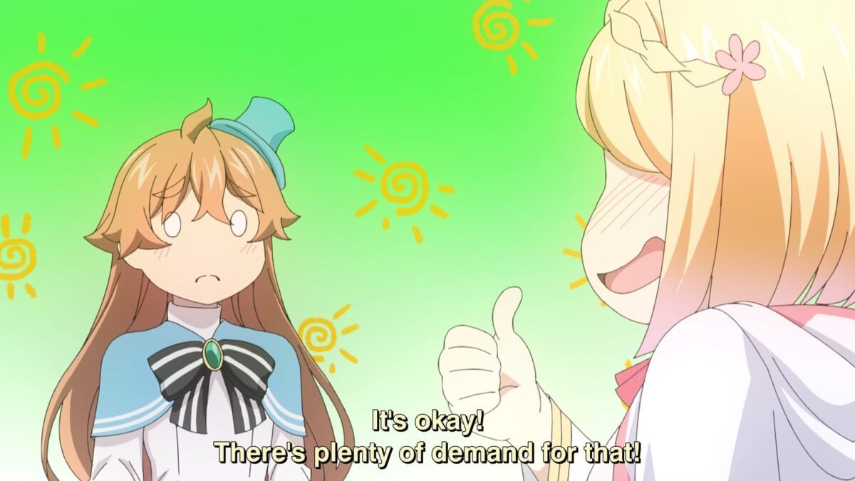 Oh, okay. It’s not Comiket but “SunComi.” Cosplaying vendors selling doujinshi was the right idea. Sakura is glad to have friends she can share her hobby with. Mariabelle says wearing the cosplay outfits reminds her of adventuring days with Hinata. And nights! Yandere Dark Elf never showed those scenes. Ha! Hinata says they never happened! Uh oh. Mariabelle’s horny devil needs action. Oops. Sakura still needs help selling her books.