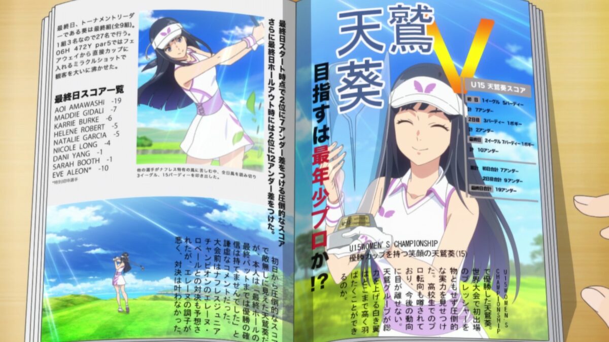 It took so long! BIRDIE WING finally showed Eve and Aoi playing a full round of golf against each other. Now, now. They were a doubles pair demolishing the muscular Sato, but that’s not how they played. Unsurprisingly, they tied again. It’s fun to see from their scorecard how their differing styles arrived at the same number of strokes. We know Eve is a gambler, while Aoi matches her shot selection to an optimized program. Eve had more bogeys but more eagles than Aoi. Aoi had more birdies but more pars than Eve. If the two played poker, Eve would go all-in on big pots more often than Aoi. But Aoi would fold more often while systematically collecting chips. It’s lovely to see the dichotomy.
