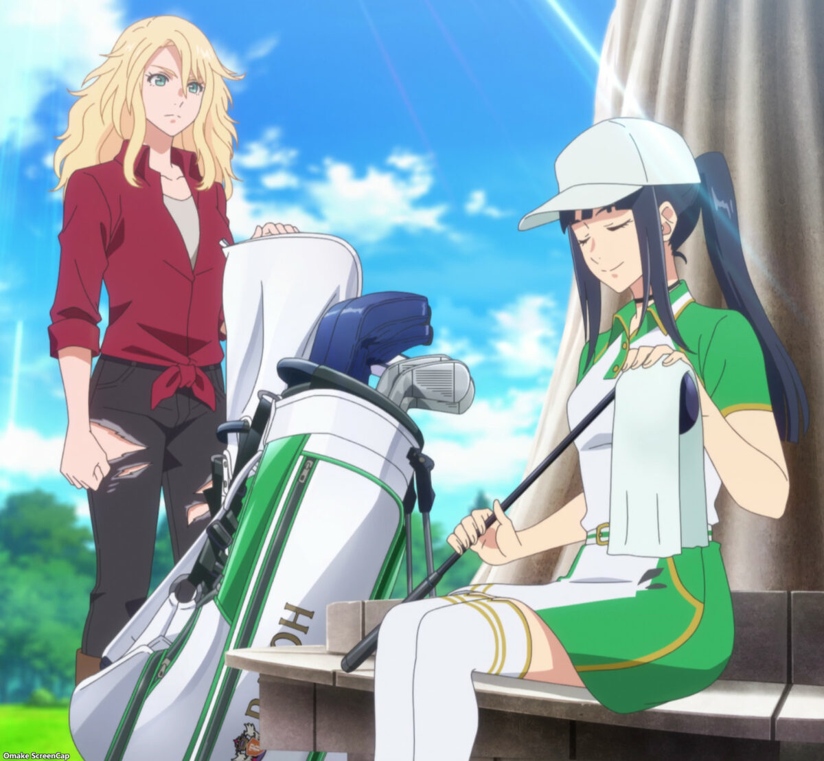 It’s the day of the qualifiers at the Athena Golf Course. It has a statue of Athena. Playing golf! BIRDIE WING makes the opponents brag for Aoi and Eve. Ha! Eve called Japanese people “rude” for staring at her beautiful face. The cute and pretty pair pisses off the other high school girls! Eve is motivated. She’ll get all-you-can-eat hamburgers from Aoi if she beats her score.