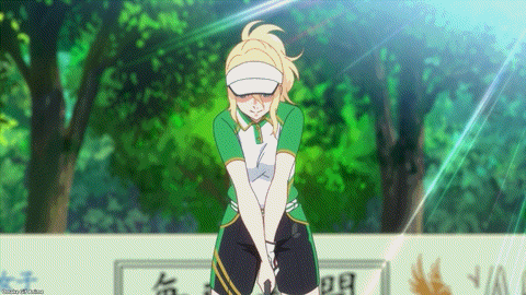 Ooh. A dark-skinned muscle girl steps up to challenge Eve and Aoi. Sato fancies herself a long ball driver. The Innocent Tyrant begins her mind games. Smile and clap! Eve shows Aoi how to do it. Pierce Sato’s heart with her Blue Bullet. Bang! Oops. Too strong. That one shot took out four other players. Haha! Eve wants to pierce Aoi too! Nope. Barrier! They’re the goofiest pair in BIRDIE WING and the most feared. Coach Reiya fired them up by goading them into beating Mizuho’s -10 score in her qualifying round.