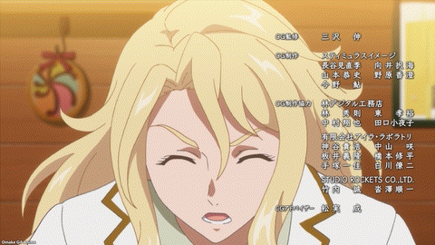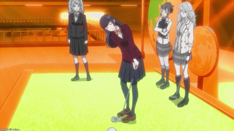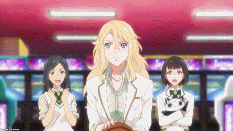 Enter the next challenger! Kuyou is confident in her putting. She shares the voice of Kuroko Shirai (Satomi Arai) from the A Certain Magical Index series, so I want to hear an “onee-sama” from her. Yeah, why? Ichina asks why Eve picks fights with everyone? Oho! Miniature golf duel! Kuyou is good at reading a putting green’s line and sticking to it. Mini golf is no match for Eve’s Green Bullet! Ichina can’t believe it. BIRDIE WING is still a ruthless mafia golf anime! Don’t be fooled by high school girls in a slice-of-life mall date setting. Eve pierced Kuyou’s heart. She can’t “Search the Line” anymore. Ooh. Her doubles partner saved her.