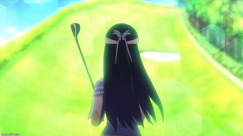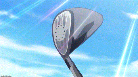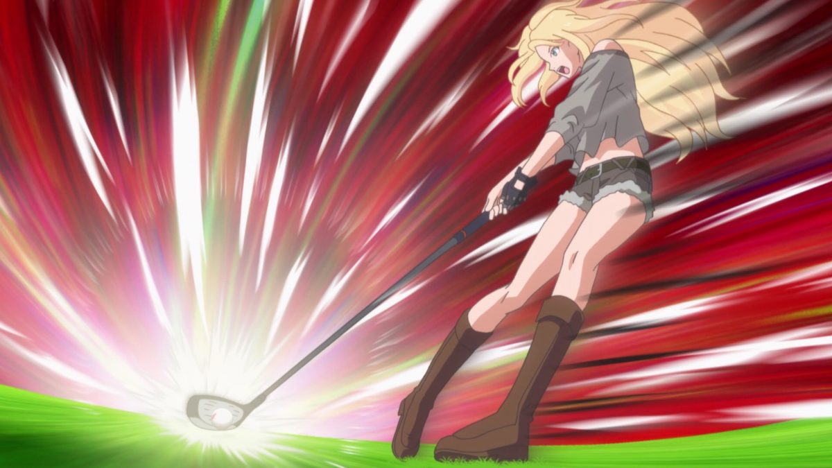 Let’s relive the scene from last week and how Aoi’s long shaft caught Eve’s attention. I take it that Aoi is the “innocent tyrant.” One hole, stroke play, on a par five. The forest isn’t out of bounds, so I’m sure Eve wants to blast right through it. Rock and roll the Direct Strike Blue Bullet! Eve has theme music. Ack. Stopped by a thick branch. Amane made Aoi go back to her standard 1-wood. Aoi feels excitement like she used to when she played with her dad. Oh, right. BIRDIE WING emphasizes that golf is fun! Eh, ask a long-time golfer what he thinks and wait for the long string of expletives to end… Huh? Why does Eve call Aoi’s fade a slice-shot? What’s the difference between a fade and a slice? The answer is if you meant to do that…