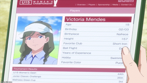 Aoi practices putting. There’s Pac-Man again. Amane recalls talking with Aoi’s mother, Seira Amawashi. Mama Amawashi claims that Aoi has two gifts: her mother and father’s genes, who were both pro golfers. Aoi doesn’t have much excitement for the upcoming U15 (under fifteen) women’s tournament. And then BIRDIE WING shows us the fated moment! Aoi saw the blue color in Eve’s Blue Bullet! Amane’s list of players looks like a video game character selection screen. Do we need to know a player’s favorite color in real life? No. Eve doesn’t look like a golfer in those cutoff shorts.