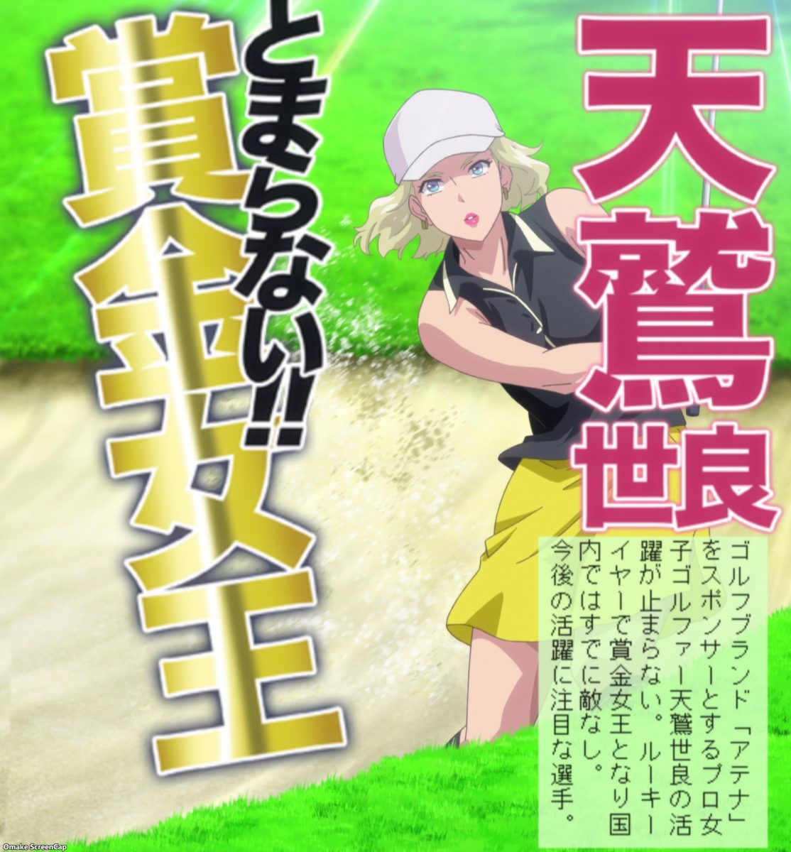 Epilogue time for BIRDIE WING. It’s the final round of Aoi’s golf championship, and she’s bored. She holds a commanding lead, so she only needs to play steady. Uh oh! Aoi saw Eve on TV! How did Eve get into the tournament? She didn’t even start the first day! Rose asked Catherine to pull strings, but that’s a lot of string-pulling. Even for the main sponsor of the golf event. Eh? The sign on the clubhouse spells the city name as “Nafres.” Is Nafrece supposed to be a creative spelling of Naples? Still, Eve isn’t in the same group as Aoi for the final round, so will there be a sudden-death playoff round? If that’s the case, I can see the BIRDIE WING season taking up both rounds of golf.