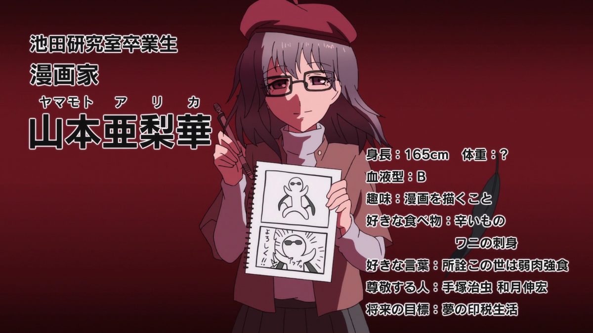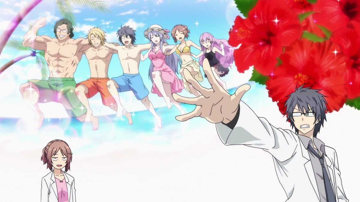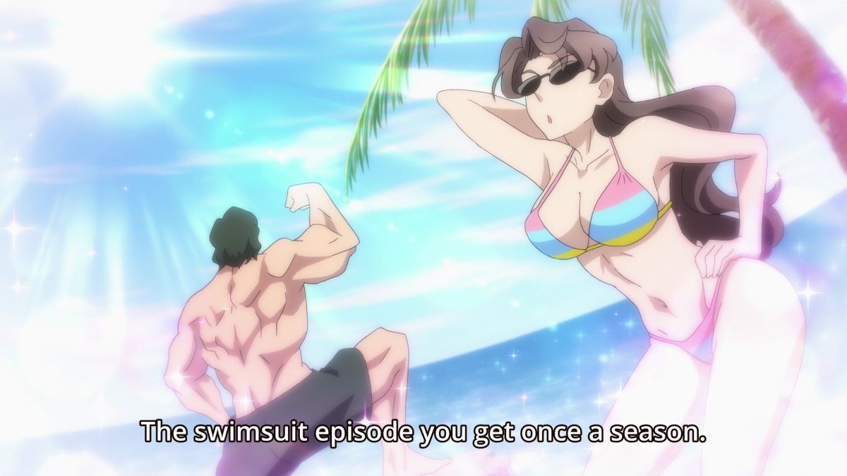 I have a mix of positive and negative feelings about Rikei ga Koi introducing another character so late in the season. The mangaka of the source material is Alfred Yamamoto. His female version suddenly showed up in the anime to push Ayame and Shinya into sexier situations during their trip to Okinawa. Sexier situations are good. A meta-level inside joke makes me ambivalent. It feels like the author ran out of ideas grounded purely in the science academy world and fell back on his familiarity with the commercial art industry. Rikei ga Koi‘s Arika Yamamoto pushes my attention out of the story just when I want to be fully engaged with Ayame dealing with hot days and hotter nights on a beach trip with Shinya. Yamamoto can make it up to me by creating lots of fanservice art of the Ikeda Lab girls in summer situations.