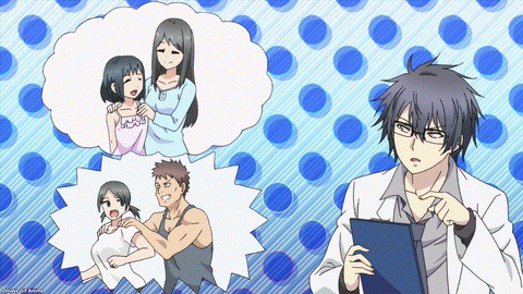 It’s summertime if Ayame is wearing a sleeveless top. Haha. Shinya got flipped for making an unseemly request from a pure maiden. Ayame just asked the same question more politely. Ah. They want to collect saliva to measure oxytocin, the “love hormone.” Anime always encourages “skinship” so here we go with the Rikei ga Koi version. Oxytocin is only released when a loved one touches a person, so this should be an easy experiment to control. Except, there might be some surprises from the other pairings!