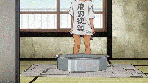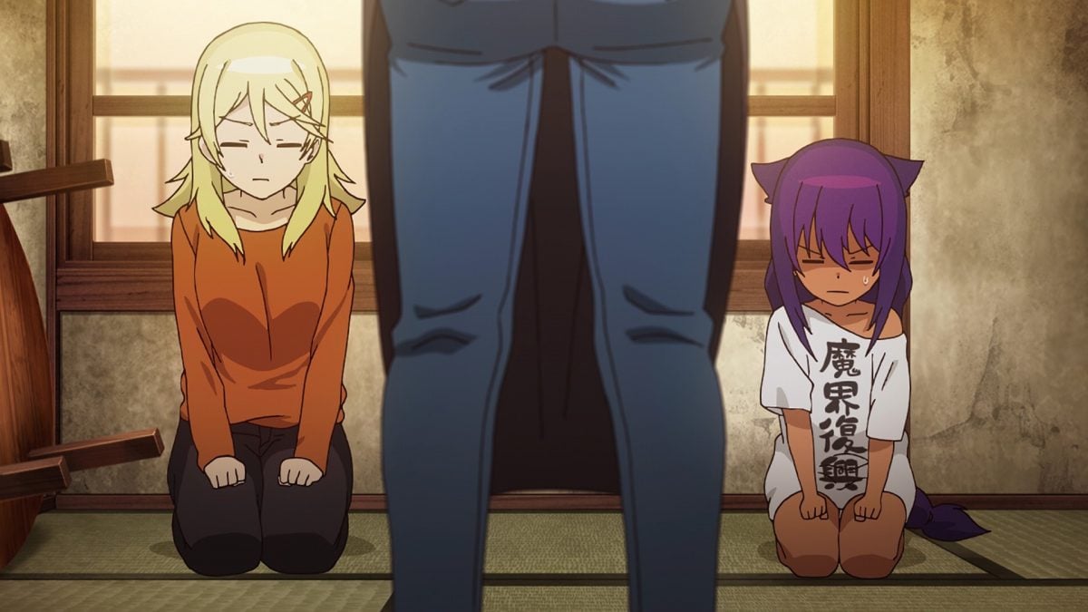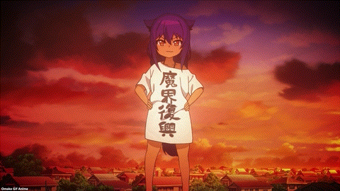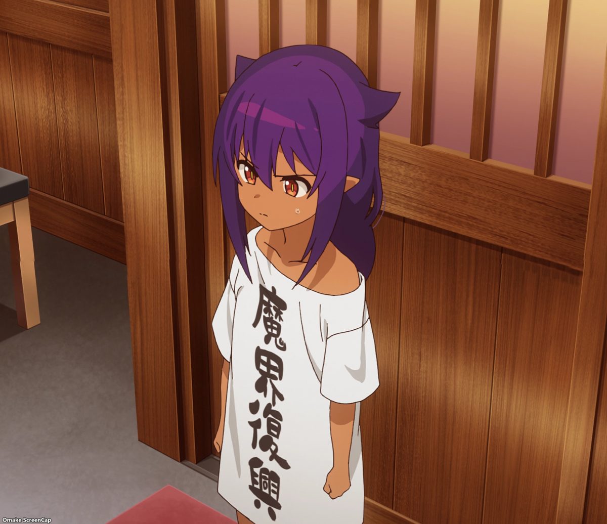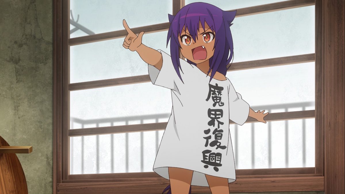 When I saw how closely the small Jahy resembled 40hara’s catgirl Kinako, I knew I needed to pay attention to what her T-shirt said. The cute catgirl has “sakana (fish)” on it, which cats want. Presumably. What does Jahysama want? 魔界復興 (makai fukkou – literally “hell restoration”) means “Restore the Dark Realm.” Now you know why each episode is “Restoration Plan X.” Jahysama is single-minded.