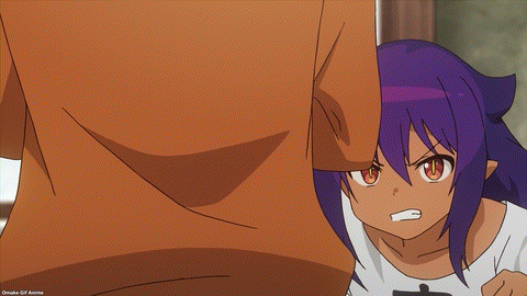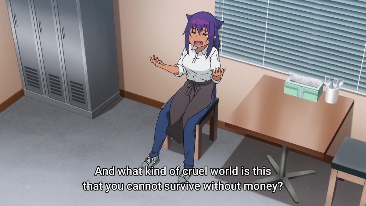 Uh oh. The Great Jahy’s next crisis. Running out of mana and reverting to Chibi Jahy! How will the boss react? By hugging her! That’s not a normal human response. She should be surprised a runaway homeless girl has a child form. Is there more to the boss than meets the eye? I hope we find out. Payday! I made the same face for my first paycheck. And she gave Jahy food to take home. She’s an angel! Jahy needs to regain her pride. Also, her crystals, powers, and the Dark Realm.