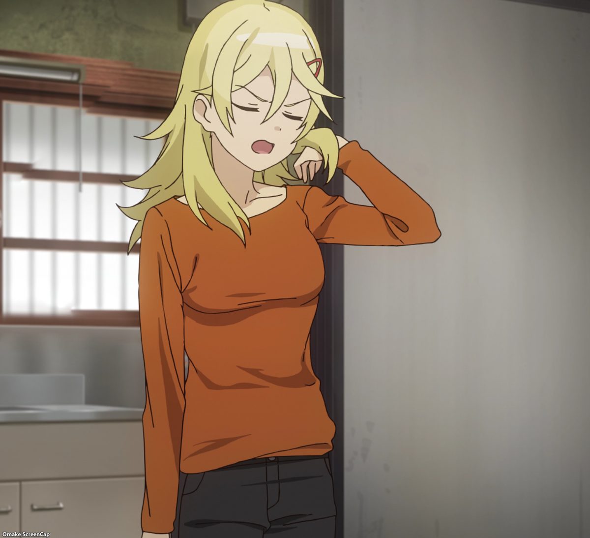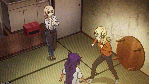 The Great Jahy’s next calamity arrived! Rent day! The landlady has wrestling moves. Crouching tiger versus hidden dragon! How many months has Jahy been delinquent on her rent? Oho. The landlady is the Store Manager’s sister. The Store Manager found Jahy first. Jahy used to live in a cardboard house by the river. She should show gratitude. Boston crab! Run! That green-haired lady in the limousine was in the opening credits. That’s nice foreshadowing here. Hahaha! Landlady runs fast! And the crisis is over. The Store Managers’s big sister will stop the fighting. Look at those flat scary eyes! Landlady has a name. Ryou-chan. The Store Manager calls Jahy “Hy-chan,” so everyone is cute to her.