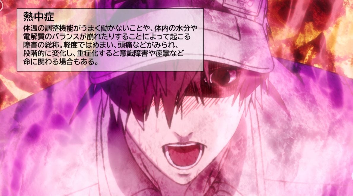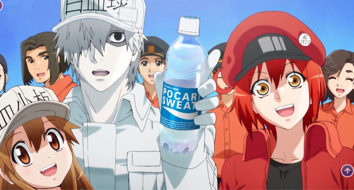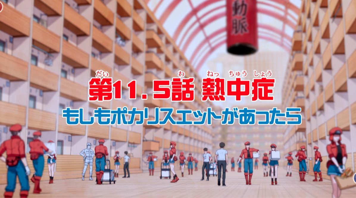 David Production and Otsuka Pharmaceutical, the company that produces Pocari Sweat, have lent their talents to a Very Special Episode version of Season 1, Episode 11, “Heatstroke.” Known as Episode 11.5, “Heatstroke—If There Was Pocari Sweat,” the episode was created to increase the public’s awareness of heatstroke, as well as highlight the importance of taking preventative measures against heatstroke. This special episode also includes the return of the original cast, including Hanazawa Kana as Red Blood Cell, Tomono Maeno as White Blood Cell, Maria Nagano as Platelet, and Mami Noto as Narrator, among others.
