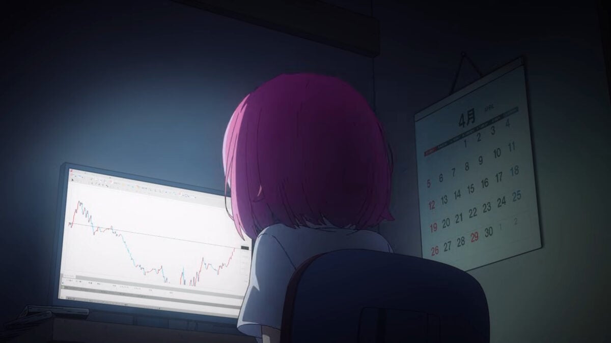 Kurumi discovered her mother’s woes early on and tried her best to help. However, she was a child and could only watch as her mother unraveled. While sitting at the funeral, she decided to triumph where her mother failed and recoup that ¥20 million loss. Kurumi took her first steps once she entered university and put her years of study to the test in the foreign exchange market. Losses and gains are sure to become constant companions on her road to financial stability.