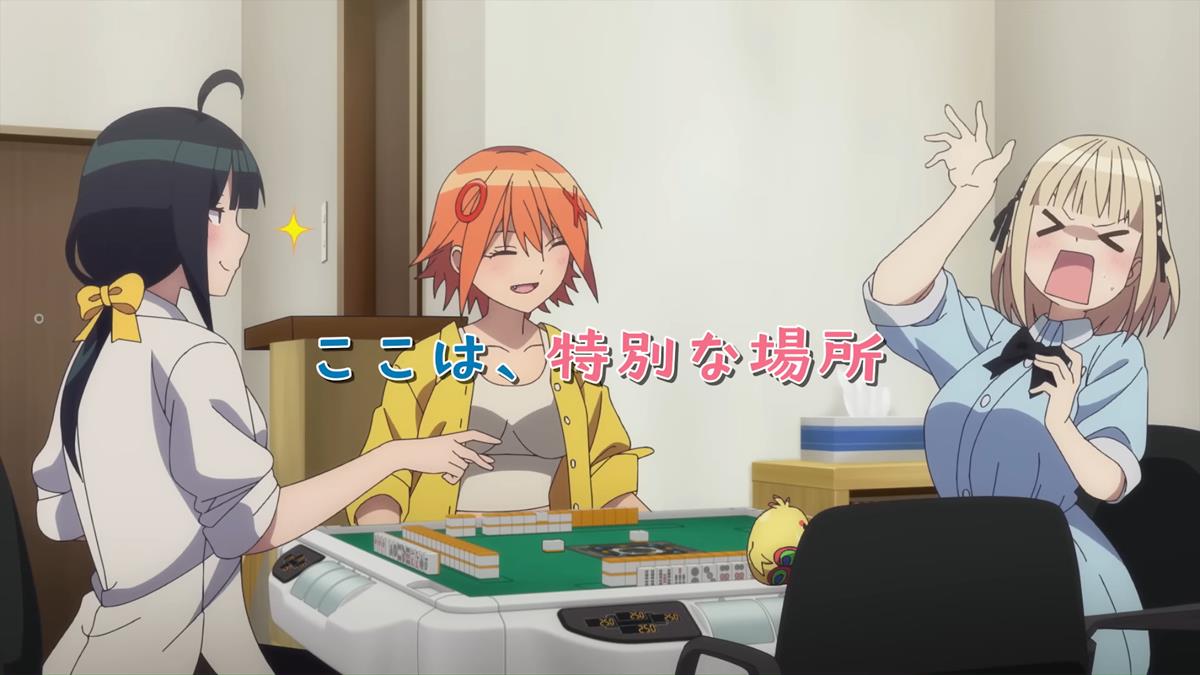 Nashiko learns that the parlor her father used to run is now vacant. Seeing an opportunity, she takes over and begins to renovate it for her own use. Though a complete novice at mahjong, she intends to play the game with her friends. She invites her friends, including Pai Kawahigashi (voiced by Iori Saeki), a friend with an affinity for cute things and with an understanding of the rules of mahjong. As well as Izumi Tokutomi (voiced by Shion Wakayama), a casual and easy-going girl who plays mahjong at family gatherings. Finally, Riche Hayashi (voiced by Yui Kondou) had previously visited the parlor when Nashiko’s father ran it, and she is glad to see it restored.