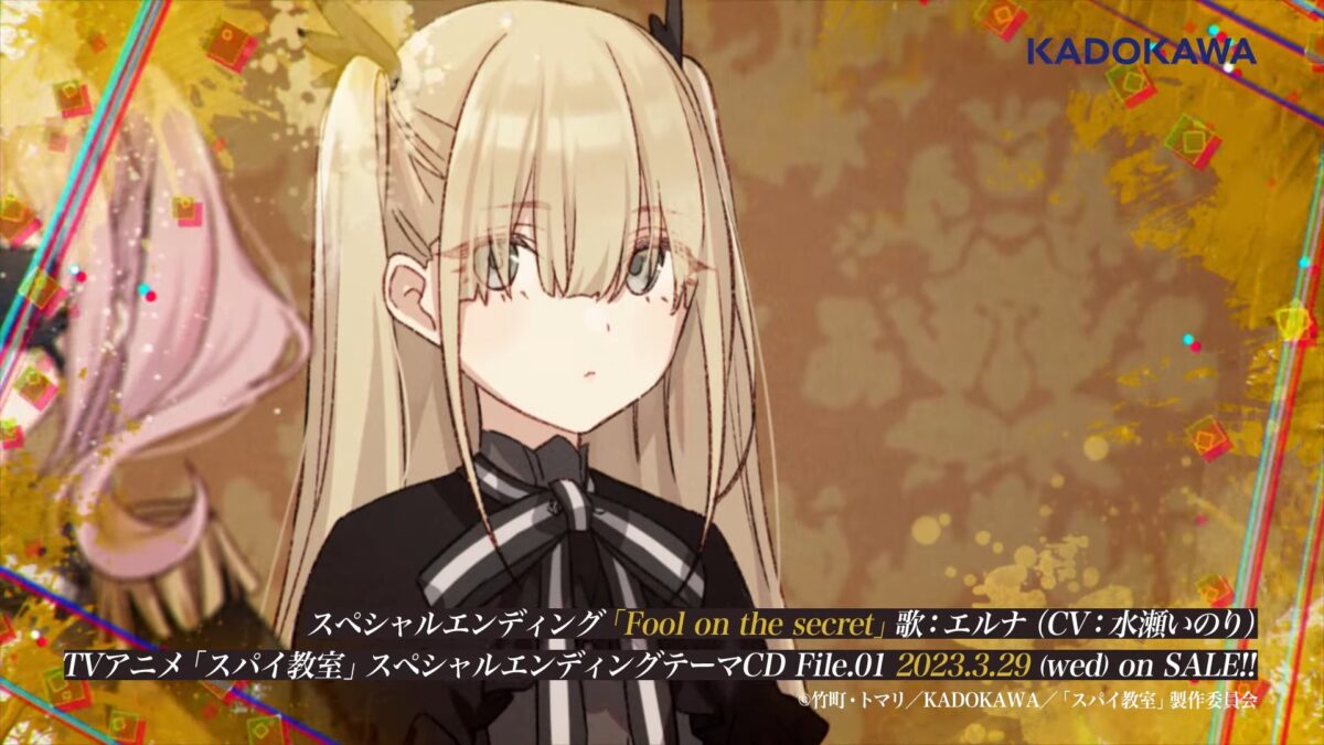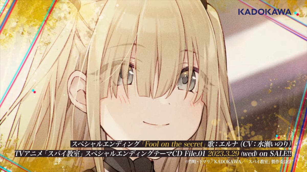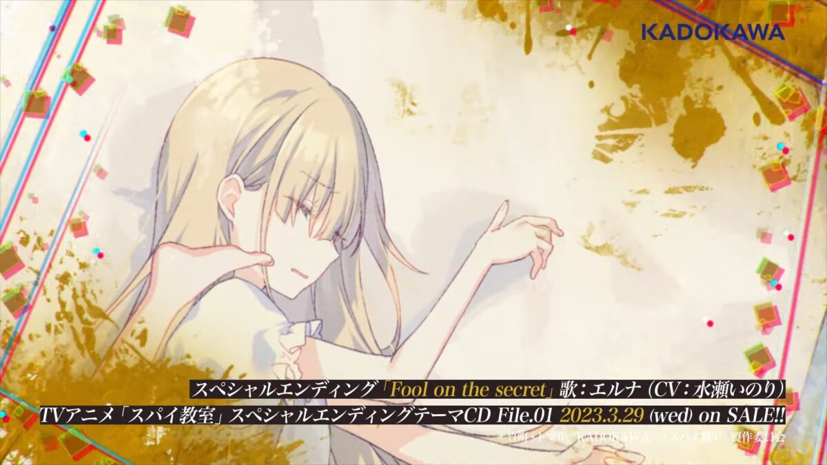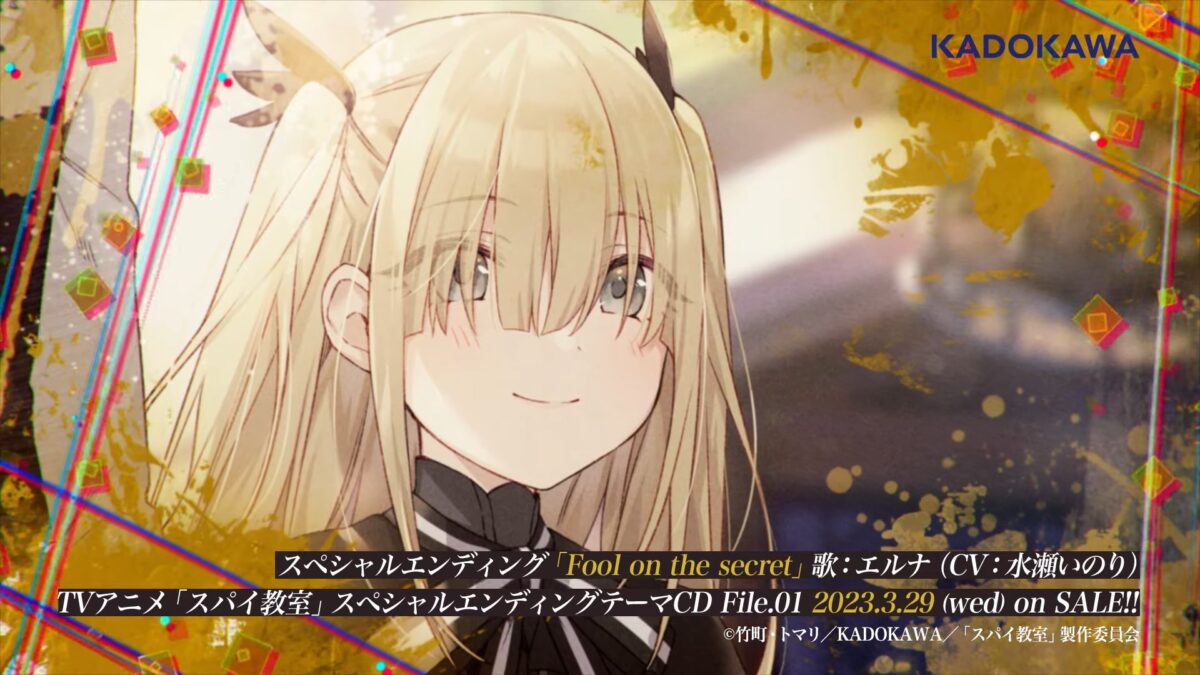 In keeping with their trend of giving each of their lovely spies from Spy Classroom their own character video, Erna, also known by her codename Fool, has her own ending theme video. Titled Fool on the secret, it is performed by Erna’s voice actress Inori Minase.