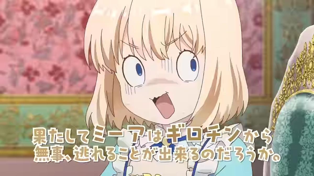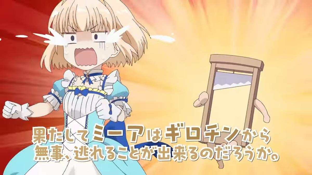 Tearmoon Empire follows the story of the titular empire’s only heir, a selfish princess named Mia Luna Tearmoon (voiced by Sumire Uesaka). Her empire fell to revolutionaries when she reached the age of 20. Right as the guillotine’s blade reached her neck, she awoke in her bed, eight years in the past. Once again at the age of 12, she retained her memories of the future, and decided there and then to change her fate, and the fate of the entire empire.