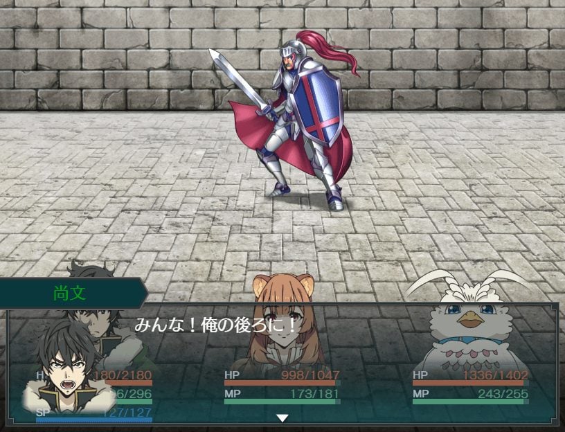 Of course, this wouldn’t be an RPG without battles. When you encounter enemies in The Rising of Shield Hero: Relive the Animation, you’ll be whisked away into a Dragon Quest style, first-person turn-based battle. Enemies occupy the top of the screen, while your party window and character portraits appear on the bottom. The Rising of Shield Hero protagonist Naofumi is unique in that he basically only fights using a shield. The game aims to adapt to that unique style of battle by incorporating a lot of unique battle systems into fights. You can use “warning” to find out what your enemy is about to do next, and then activate “covering” to shield your teammates from an incoming attack. You can even use “capturing” to force the surrender and servitude of your enemies.