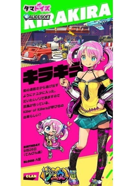 First in the DOHNA DOHNA: Let’s Do Bad Things Together! line is Kirakira, a “combat specialist” who you must hunt in Asougi City and recruit to be a prostitute for your gang. She’s nicknamed the Killer of Killers, showing how dangerous she is.