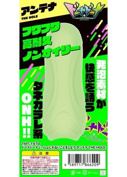 Antenna’s onahole is green in color, and promises 80/100 for stimulativeness, 60/100 for tightness, and 70/100 for vacuum suction force.