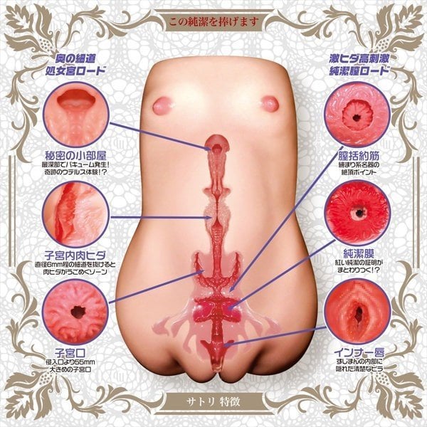 Enjoy internal shots of the Pure Bride Virgo SATORI torso toy. Push open the large, soft outer lips to reveal a realistic labia inside. Keep going, and you’ll enjoy an amazing tunnel of twists and turns which will take care of your internal stress in no time. There are several side passages that serve to hold lotion and keep everything well-lubricated, a “tight zone” that squeezes you as you push past, and a large space at the back where you can finish when you’re ready.