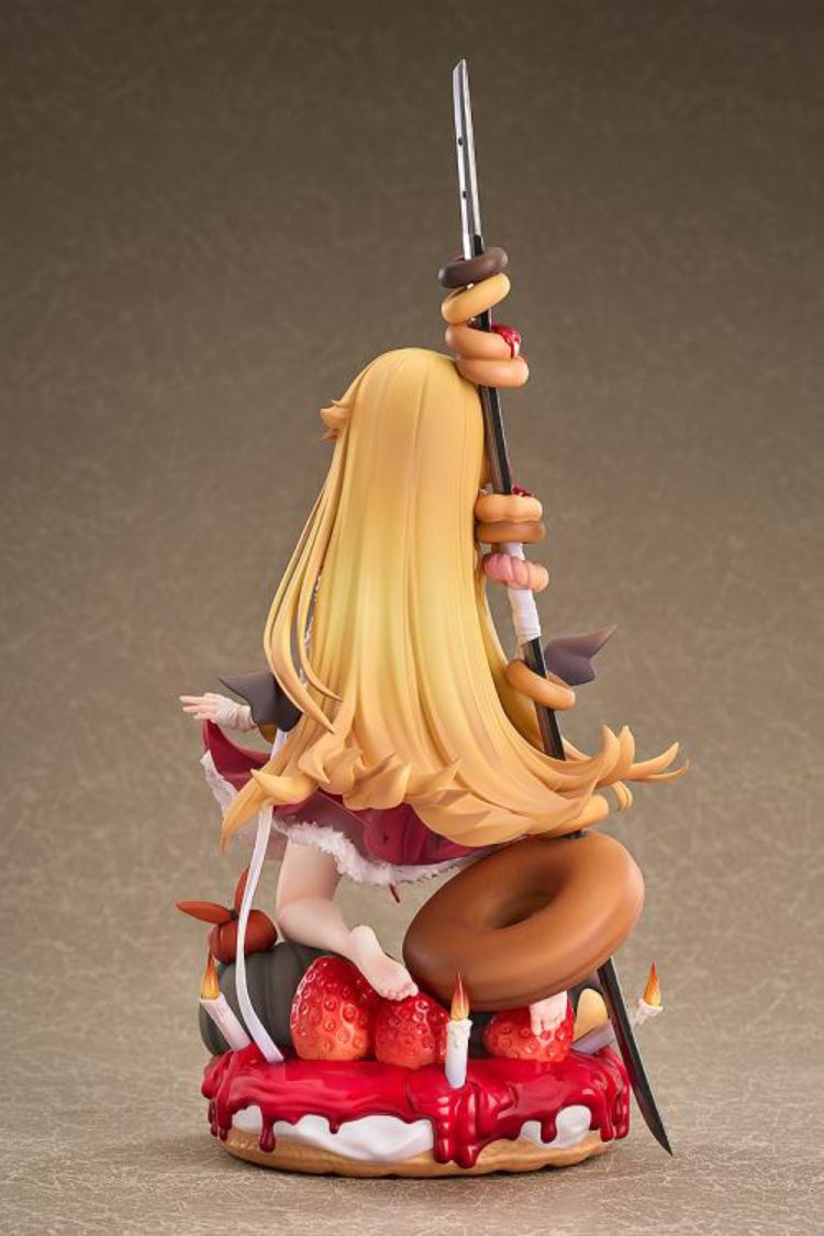 This figure features Shinobu in a ragged and torn outfit. The vampire loli smugly kneels on top of two jack-o’-lanterns shaped like Yotsugi and Arararararararararargi (tee-hee, I flubbed it). The figure’s base is a further nod to Shinobu, a big strawberry cream doughnut. And Shinobu’s love for doughnuts is so blatant in this figure that it’s diabetes-inducing. Even Shinobu’s sword, Kokorowatari, was reduced to a doughnut stack.