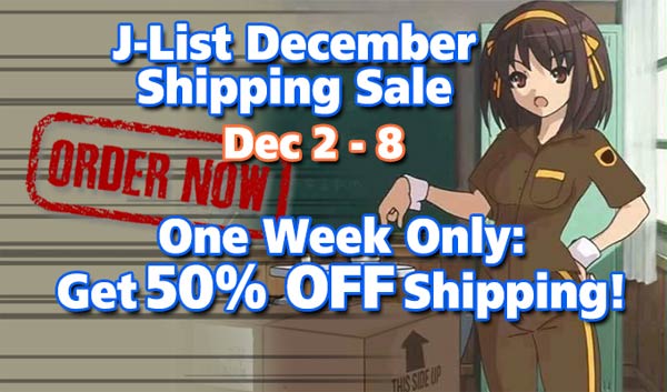 December is now here, and we’ve got great news: a huge 50% Off Shipping Sale! For one week, through December 8, get half off your shipping, whether SAL, airmail or EMS! Think of all the awesome figures, plush toys, snack and “H” products you could buy! (Choose EMS for delivery by Christmas.)