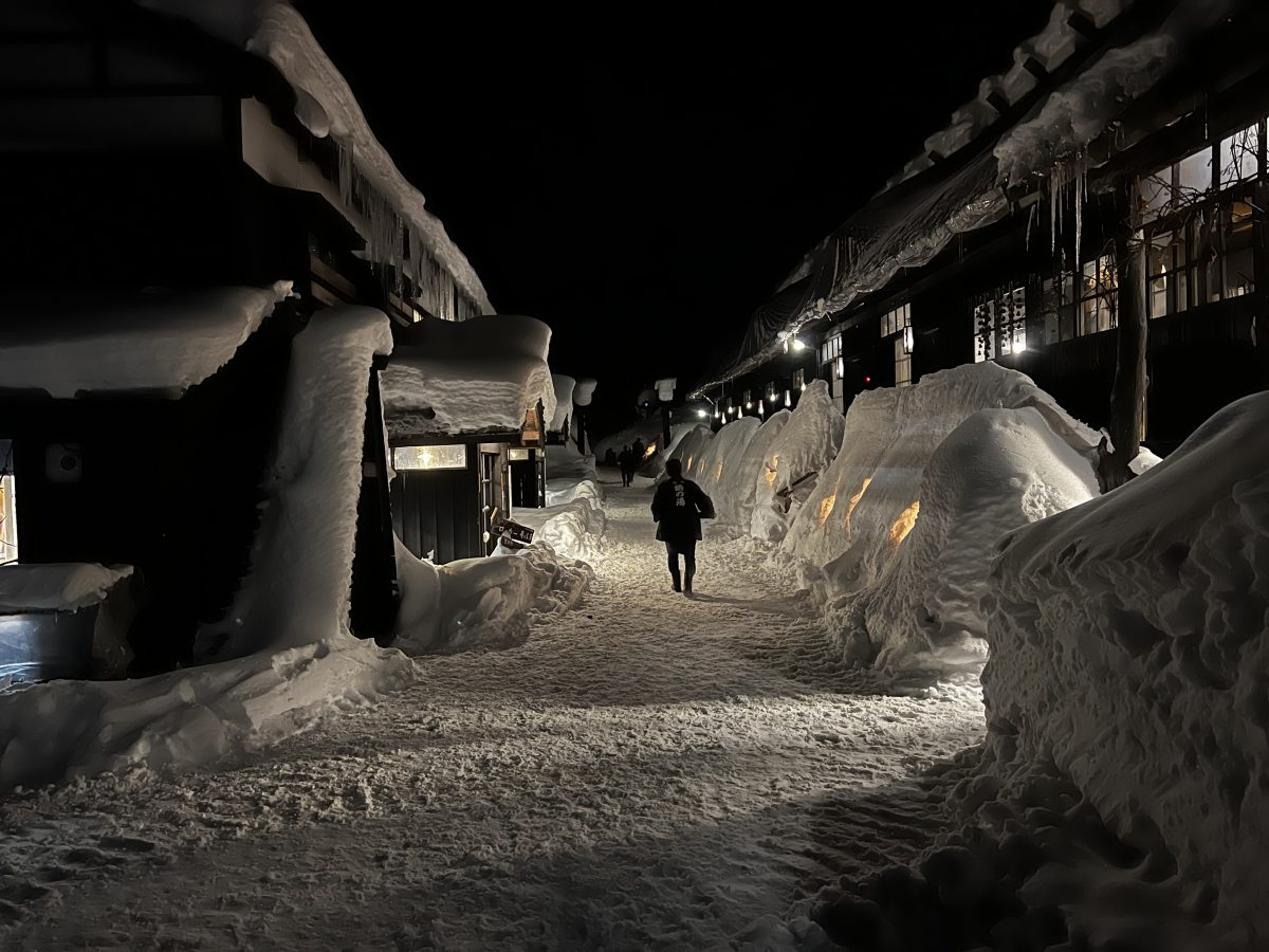 Another place I can recommend is Nyuto Onsen, a collection of old hot springs in the mountains of Akita Prefecture. I stayed at Tsurunoyu Onsen, which has been operating continuously since the Edo Period. It’s a series of baths, including a rare kon’yoku hot spring for mixed bathing, that was great to visit. I’ve got a fascination with traditional Japanese igloos called kamakura and was thrilled that the onsen inn had them for us to take pictures of.