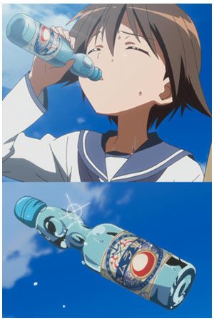 I’m a fan of Strike Witches, a fun anime that blends cute moe girls with World War II-style mecha and, er, pantsu, though naturally I only watch it for the animation and story. In the new Strike Witches movie there’s a scene in which a sailor on a Japanese aircraft carrier tosses Yoshika an ice cold bottle of Ramune, so I thought I’d write about that today. Ramune is a lemon-lime flavored Japanese soft drink (the name comes from the English word “lemonade”) first bottled in Kobe in 1872, making it older than Coca-Cola or Dr. Pepper. It made use of the then-newfangled Codd-necked bottle design that placed a glass ball inside the bottle to create an airtight seal, requiring the purchaser to carefully push the ball down then hold the bottle at a level angle while drinking. Because Japanese Imperial Navy ships carried equipment for making carbon dioxide, Ramune was a popular on-board drink since the sailors could manufacture it themselves while at sea. The sight of a Ramune bottle is sure to cause Japanese to exclaim natsukashii (nots-ka-SHEE), meaning “that makes me feel so nostalgic I could die,” and virtually all Japanese claim to remember growing up so poor that the only toy they owned was glass Ramune marbles, which has to be some kind of strange racial memory unique to Japanese people. The Ramune brand isn’t owned by any one company but (like the Kewpie Doll) is generic, manufactured by several different bottlers throughout Japan. If you’re interested in trying some authentic Ramune soda, we’ve got several awesome flavors in stock in San Diego.