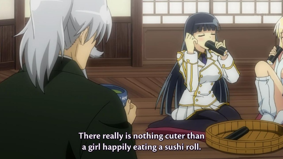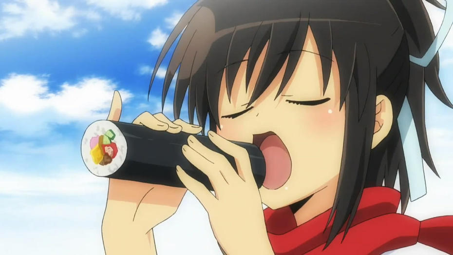 Naturally, the image of eating a long, cylindrical shape was too good for Japan’s hentai artists to pass up, and a trope emerged on Pixiv of showing anime girls eating their ehomaki rolled sushi in suggestive ways. The trope was helped along by shows like Seitokai Yakuindomo and Senran Kagura that embraced sexy sushi roll eating visual gag.
